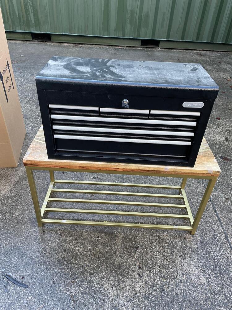 Garden items inc: various tools, potting bench, sack barrow, wheelbarrow