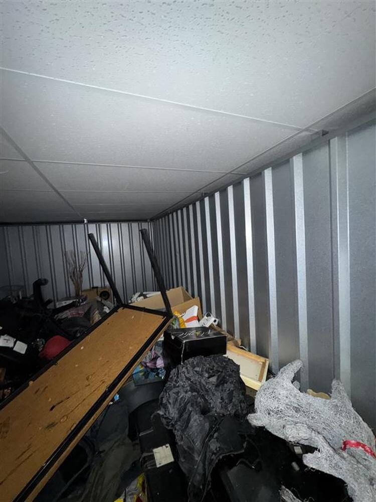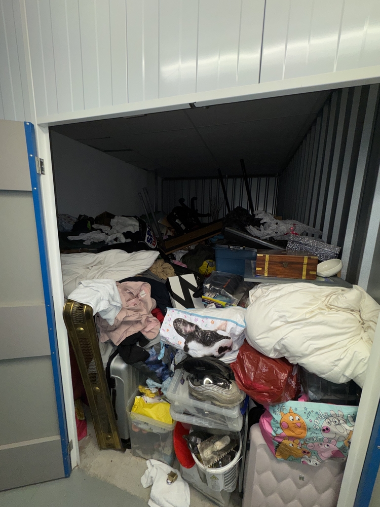 Large unit with loads of personal items, clothes, suitcases, boxes of goods.