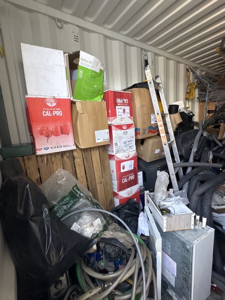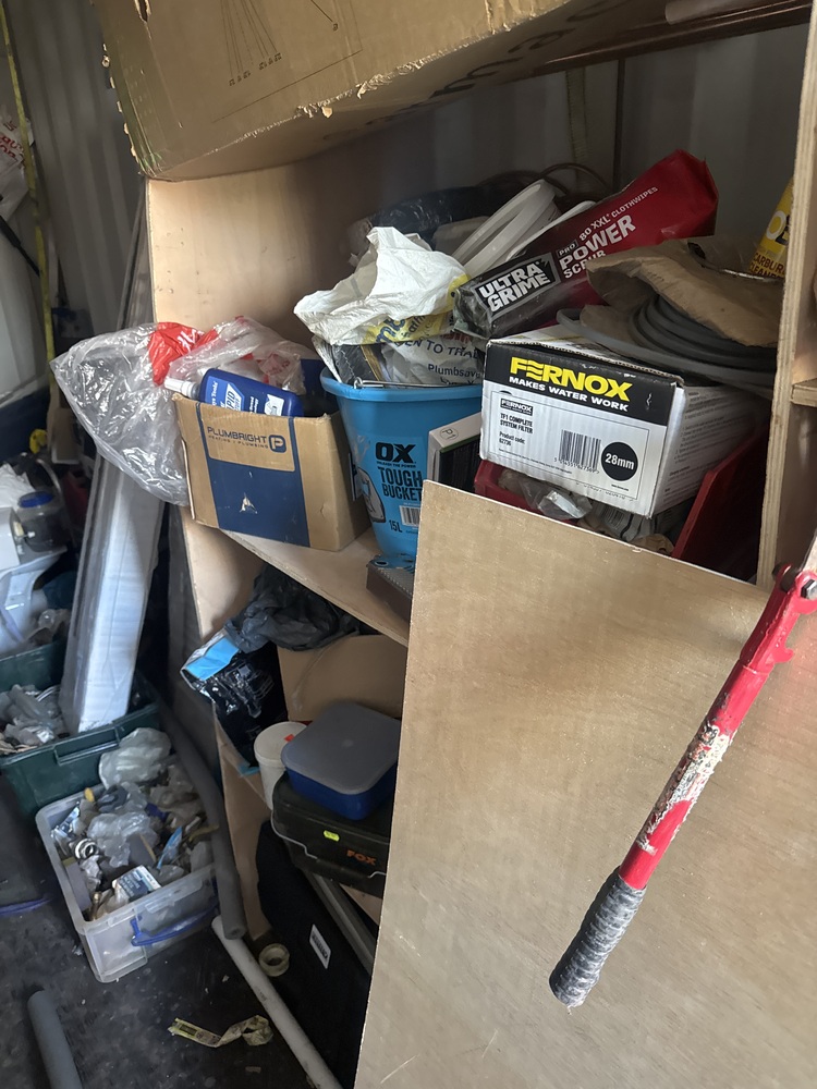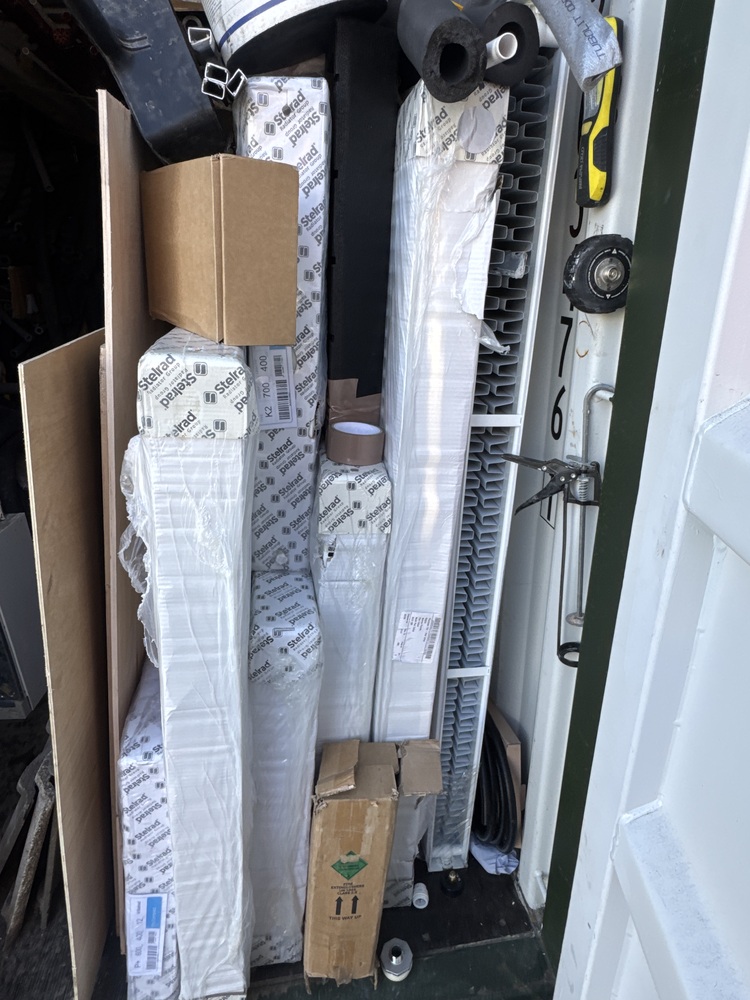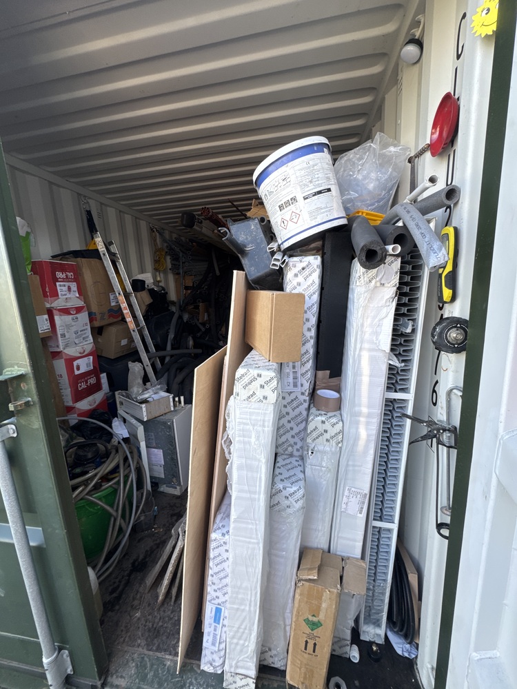 Auctioning the full contents of a storage container containing a selection of plumbing tools and equipment. The unit includes various plumbing-related items suitable for tradespeople, contractors, or resellers, along with multiple radiators in assorted sizes and styles. Also included are lengths of copper piping and related materials, ideal for reuse or resale.