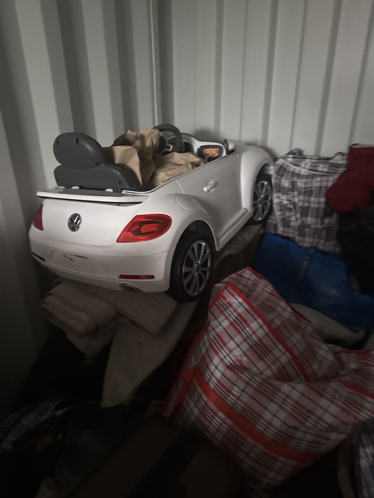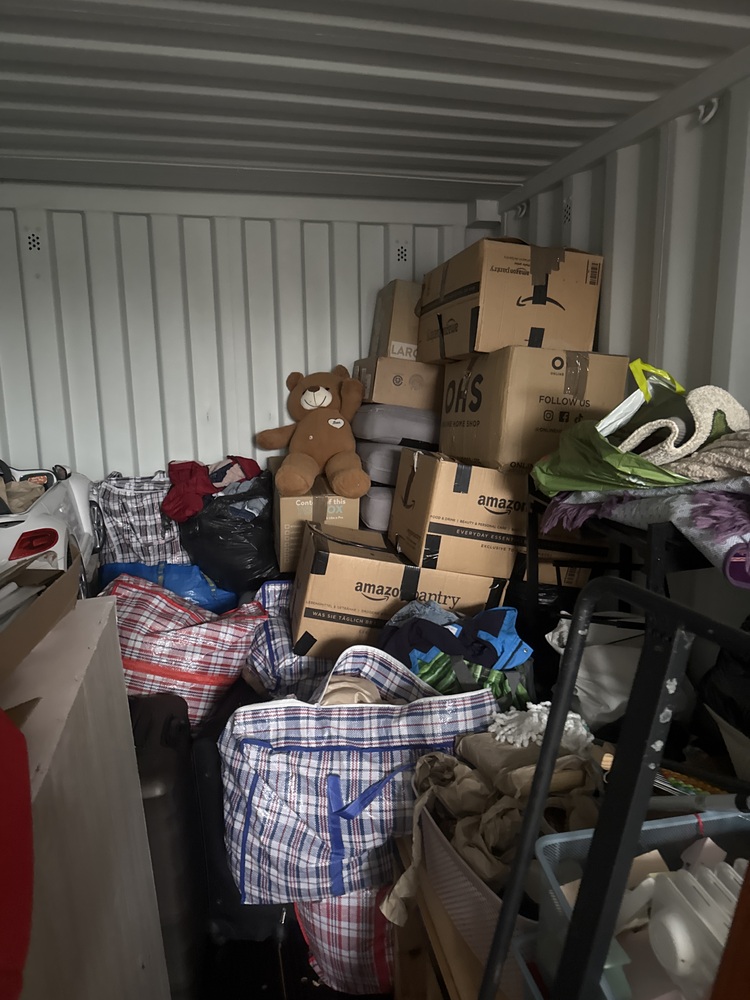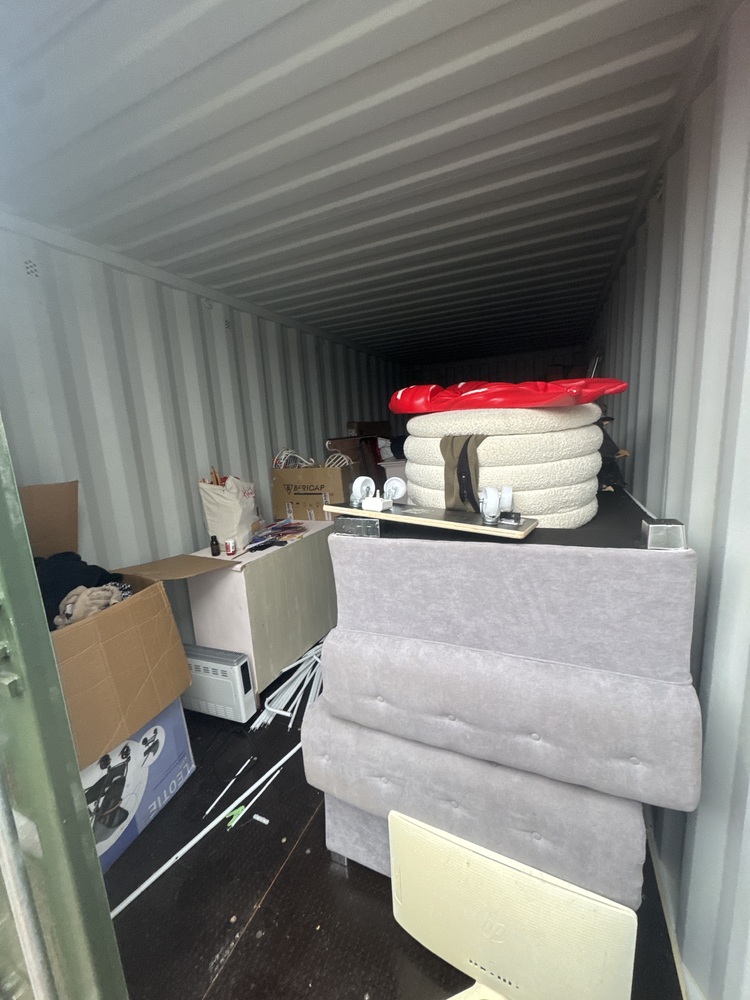 Auctioning the full contents of a storage container containing a storage unit, two grey sofas, a children’s ride-in car, and various boxes and bags. The sofas appear suitable for home use, rental properties, or resale, while the storage unit offers practical household storage. Boxes and bags may contain mixed household items (contents and condition unknown).