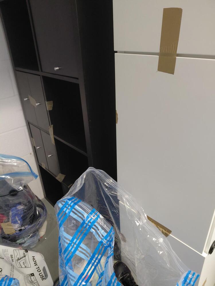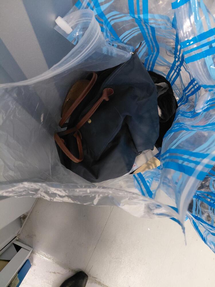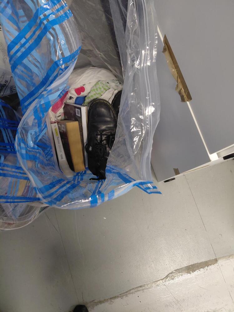 tall white cabinet, black gloss tall cabinet, 4 sacks of assorted items, books, crockery, handbag, clothing, shoes