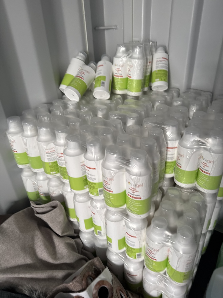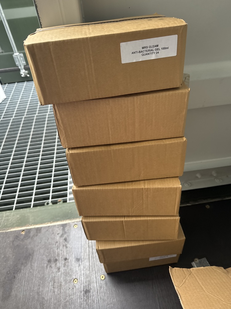 Auctioning the full contents of a storage container containing a quantity of antibacterial hand cleanser and gel, along with a selection of bags and suitcases. The container includes various types and sizes of travel and storage bags, suitable for personal use, resale, or commercial purposes. Antibacterial products appear ideal for retail, workplace, or general hygiene use.