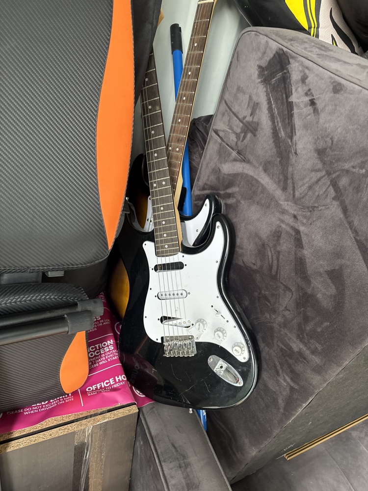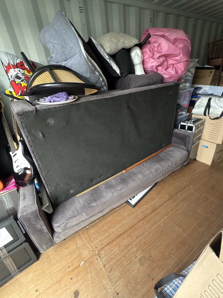 Auctioning the full contents of a storage container sold as one lot. Items include a grey fabric sofa, two guitars, multiple wooden chairs, and a wooden cabinet suitable for storage or display. The container also holds various bags and assorted boxes containing mixed household items.