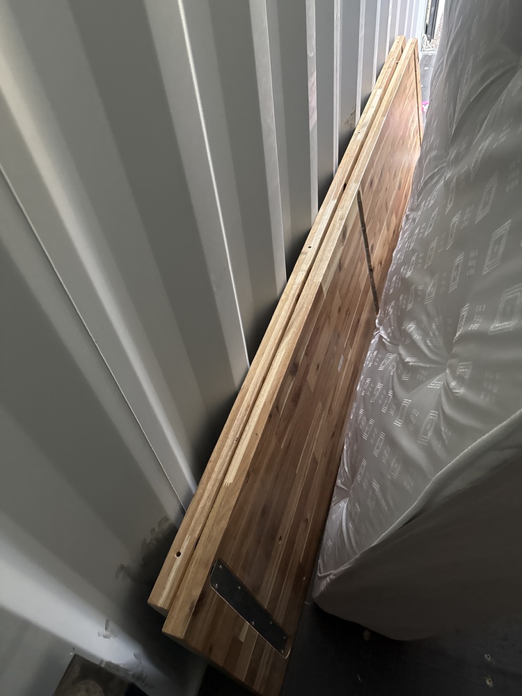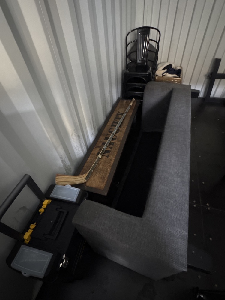 Auctioning the contents of a storage container sold as a single lot. Items include a divan bed base with mattress, a grey fabric sofa in modern style, a long narrow coffee table, and a large table with metal chairs. Ideal for furnishing a home, rental property, or resale. All items are stored together and are sold as seen, untested and unchecked for condition.