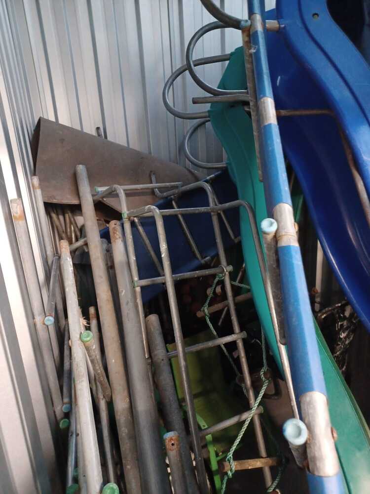 Metal garden furniture, 1 round table and 3 metal chairs plus a child's metal climbing frame and slides.
