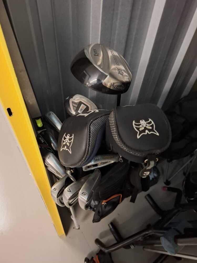 Ladders, dismantled drawers, dismantled wardrobe, golf club set, bar stools, golf trolley, deck chair, set of shelves x 2 amazon tablet, tool boxes, saw stand.