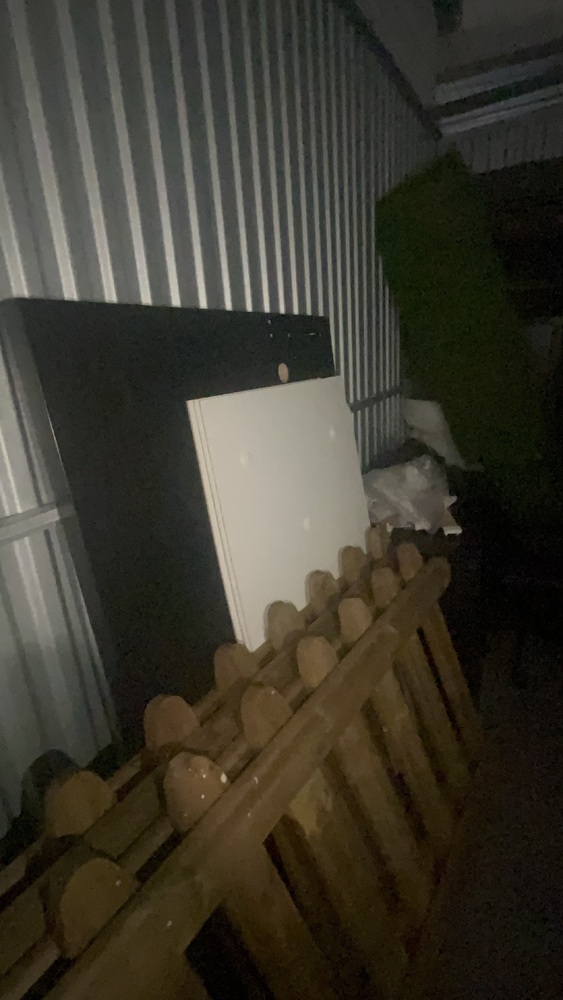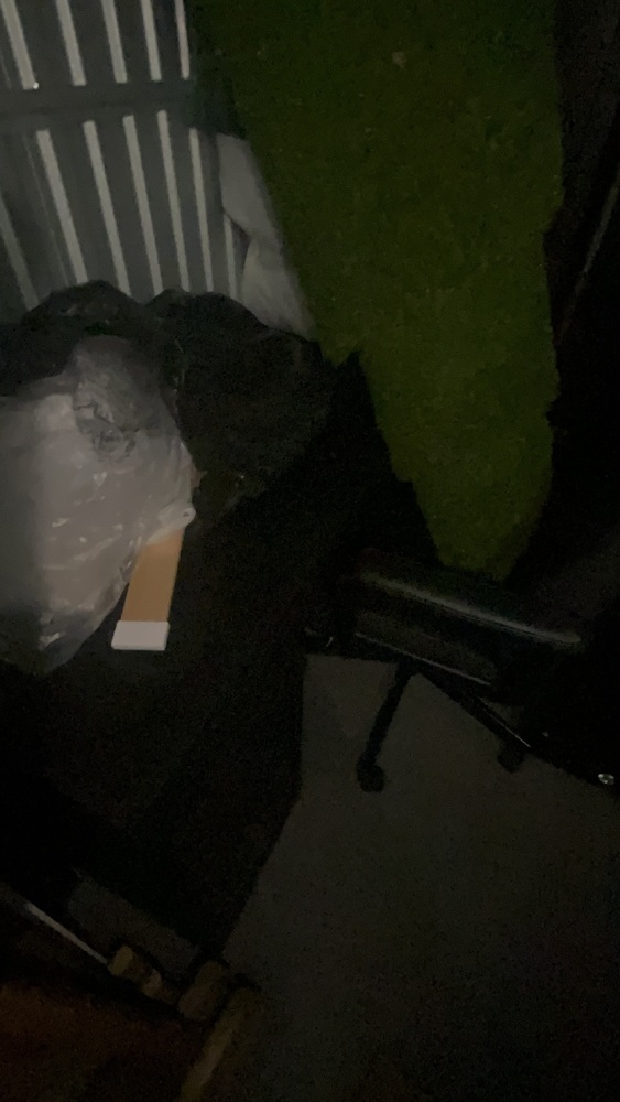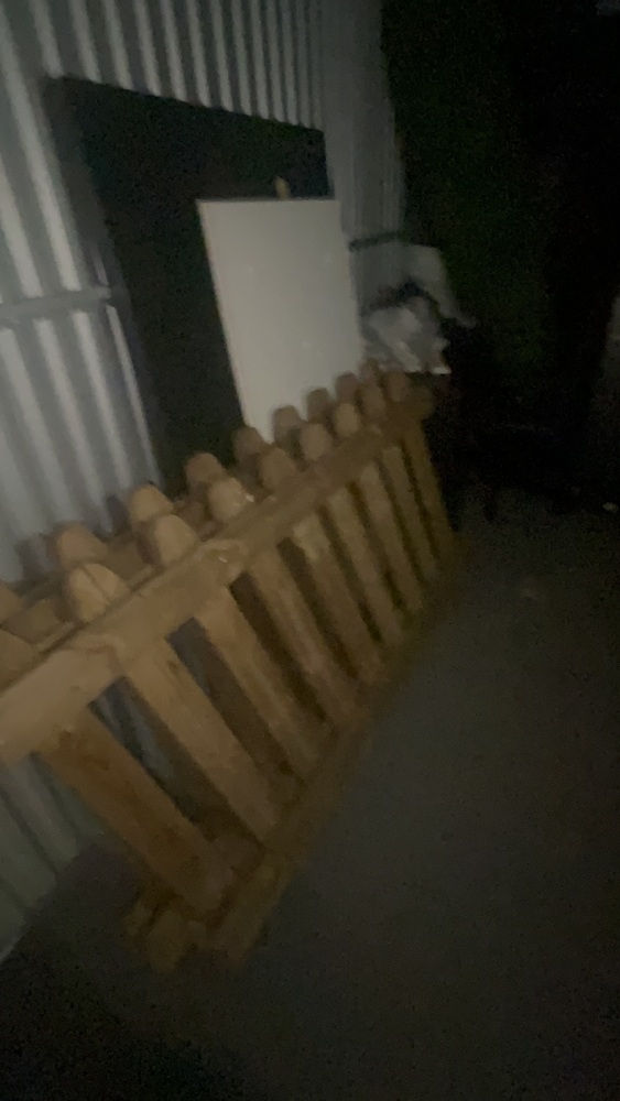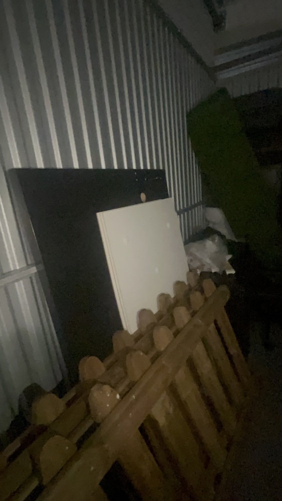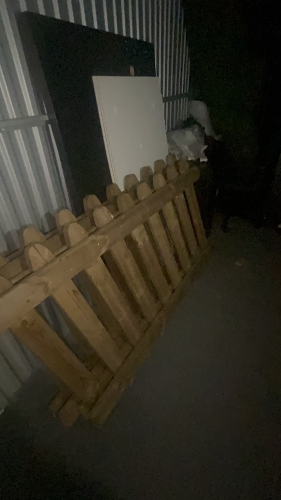 Unit has wood, fencing for front garden, solid wood. Artificial grass roll. Office desk, office chair, bed, sofa to cabinet.