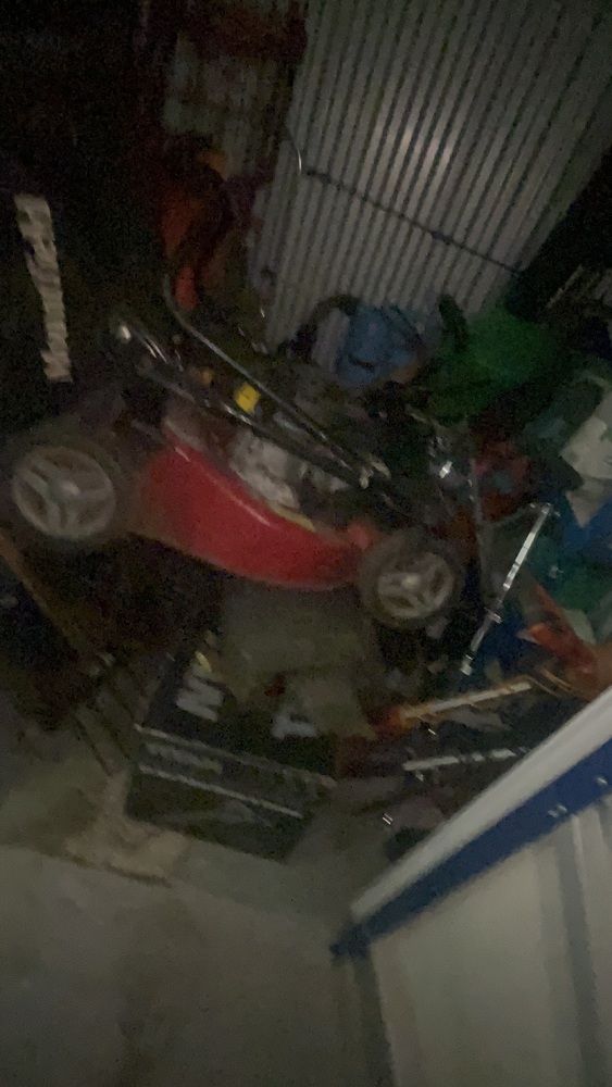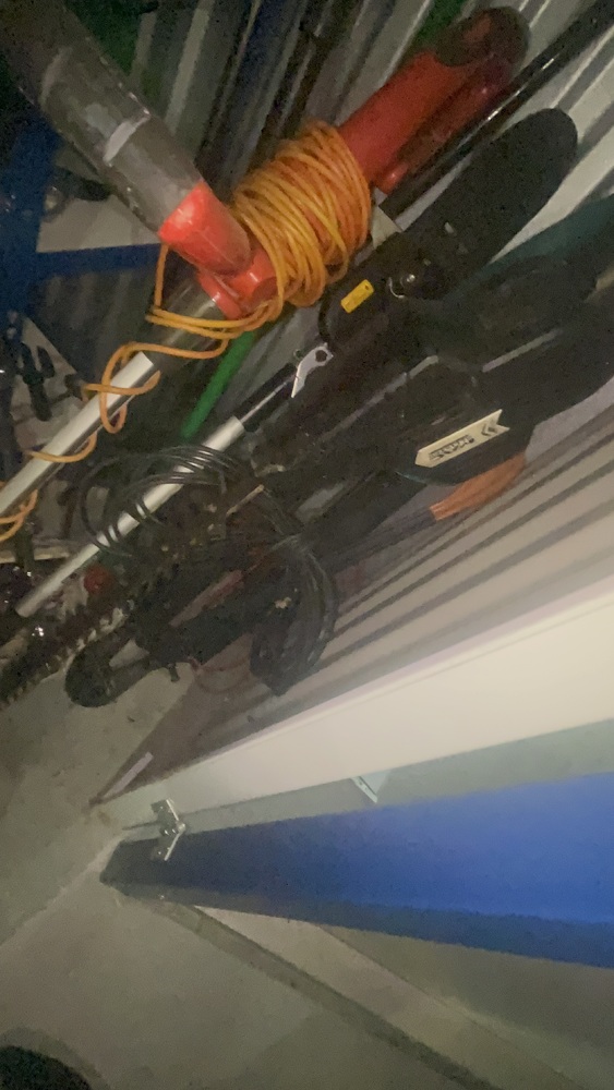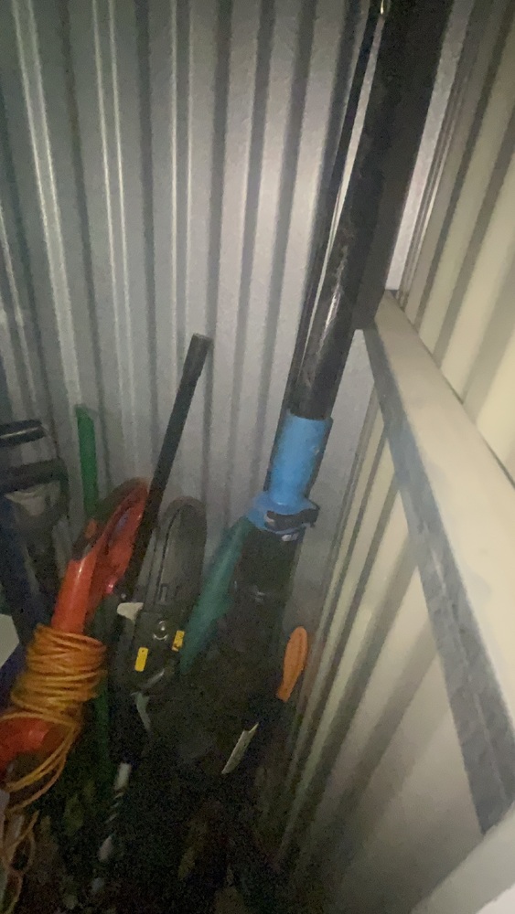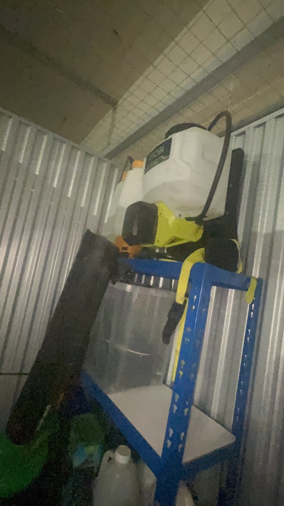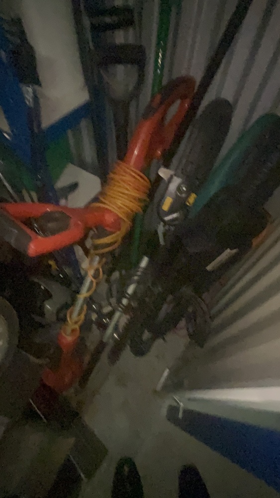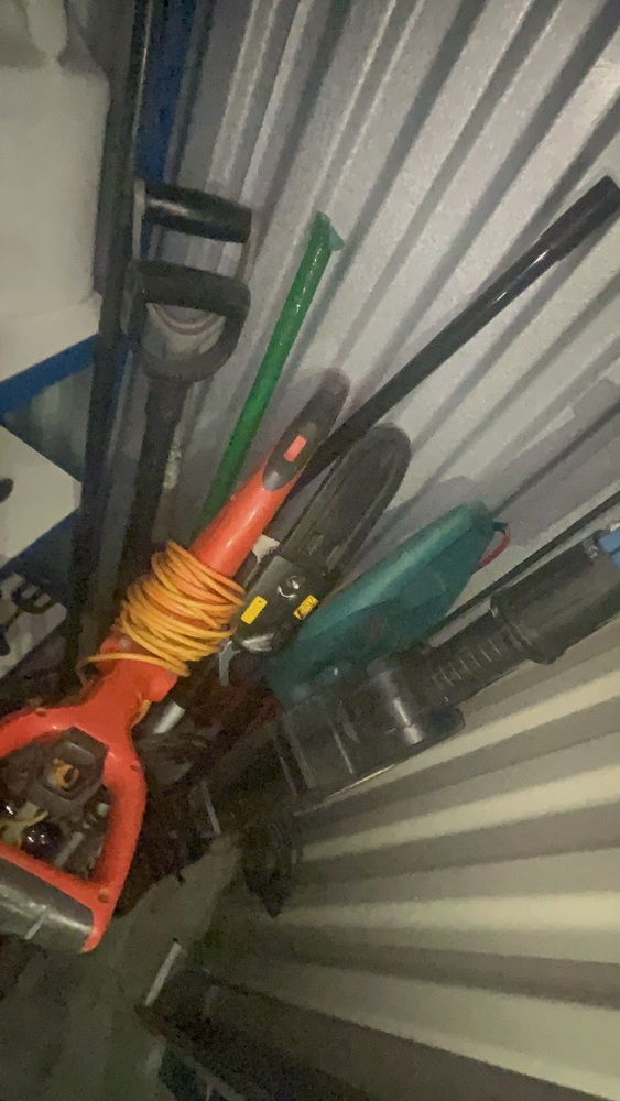 Petrol lawn mowers which there are two off. Battery pack weed sprayer. Hedge trimmers multiple. Large leaf blower.