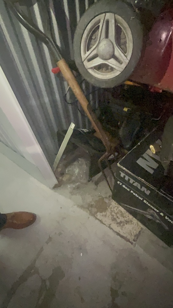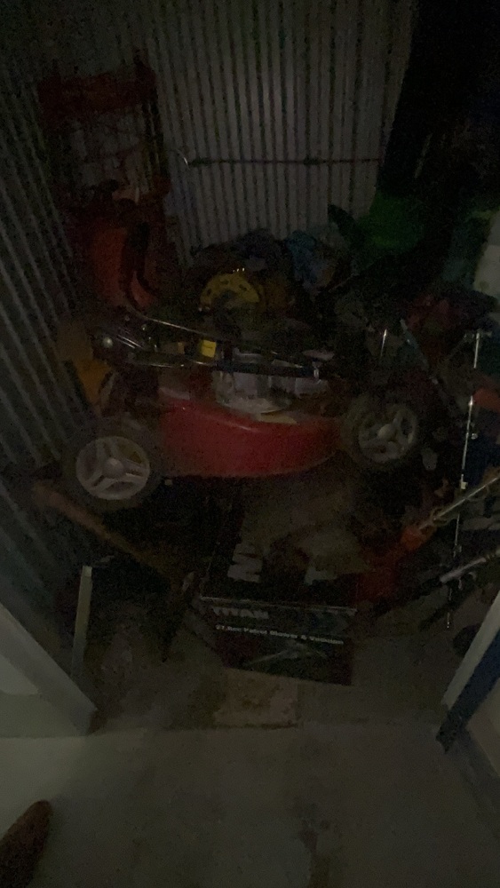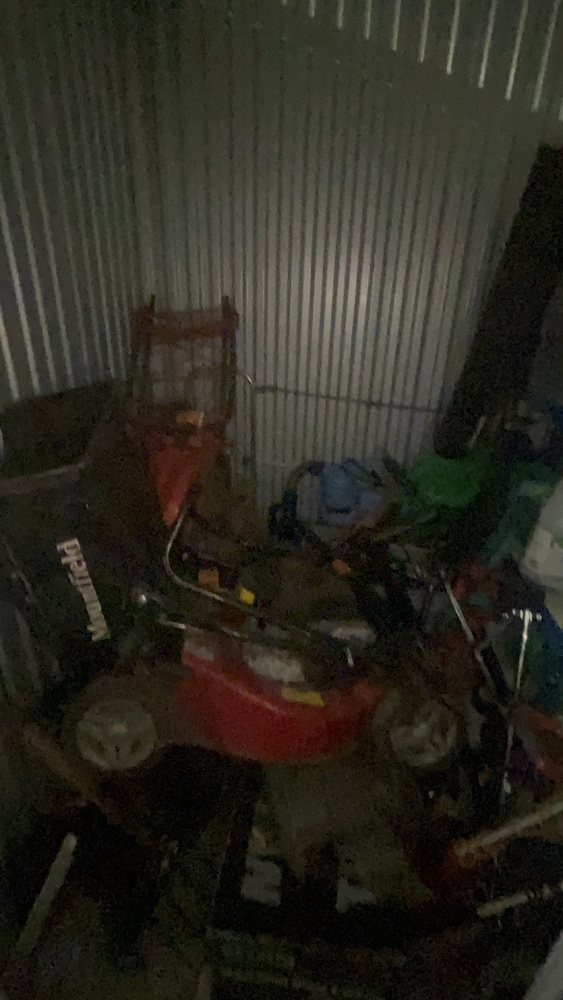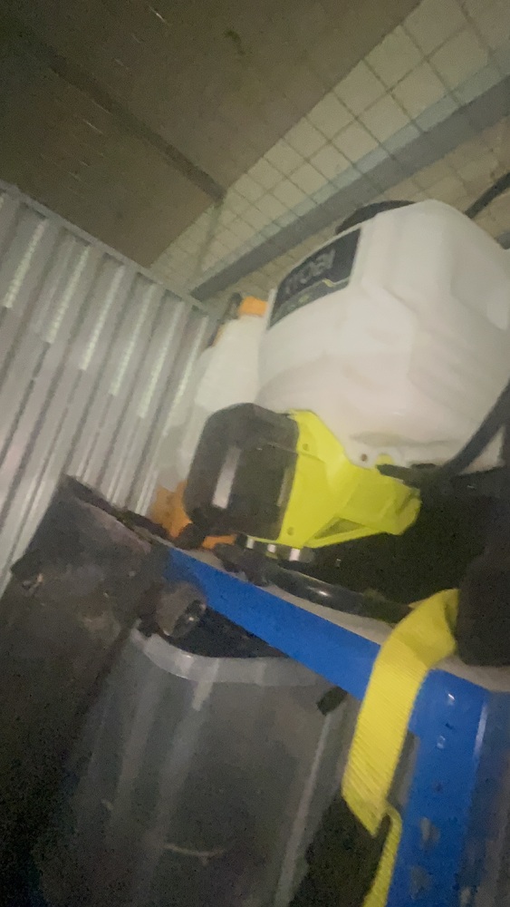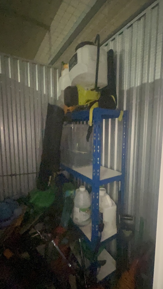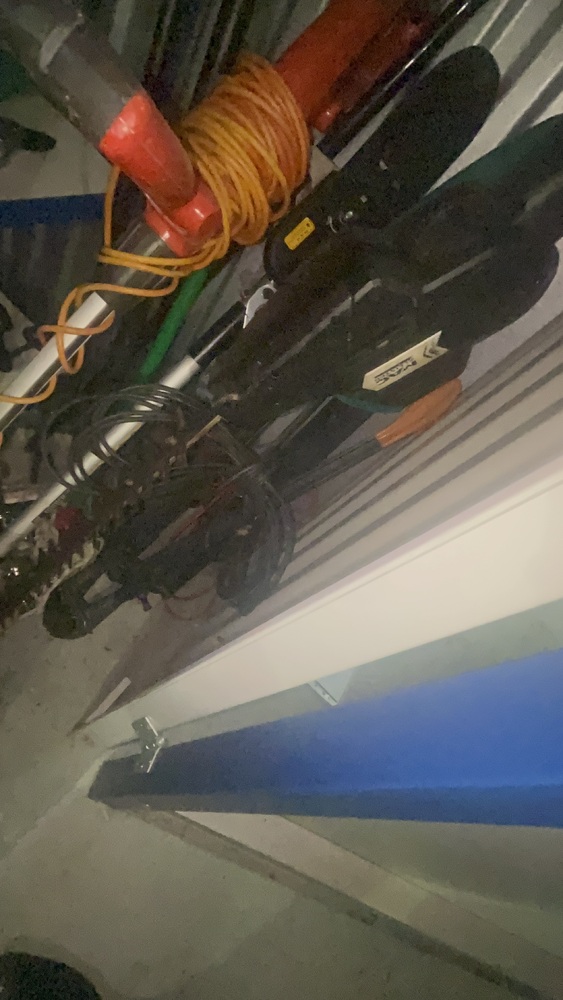 Petrol lawn mowers which there are two off. Battery pack weed sprayer. Hedge trimmers multiple. Large leaf blower.