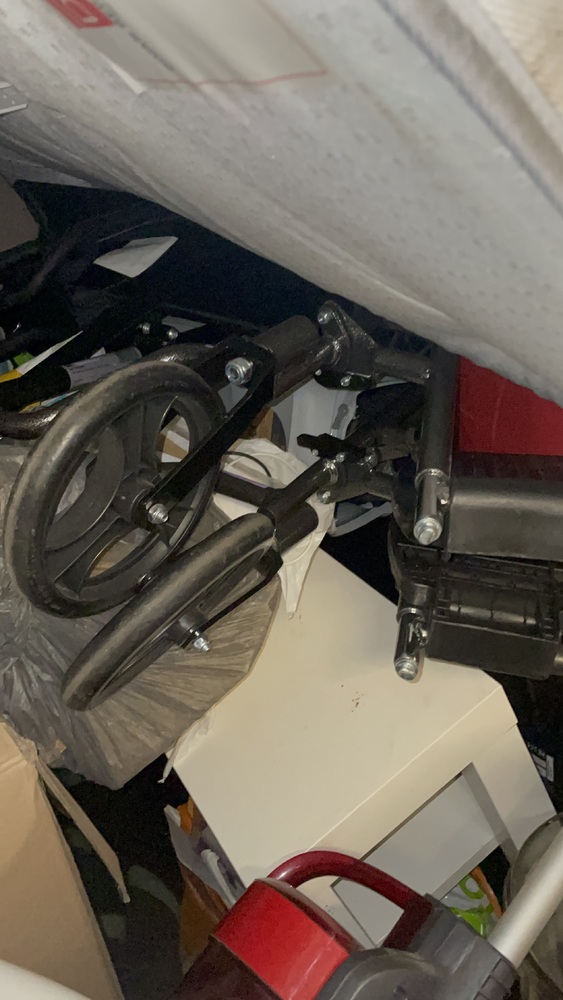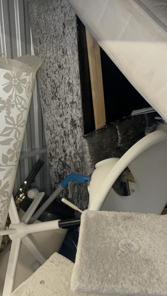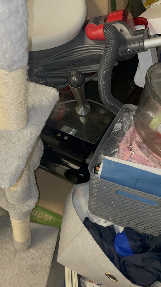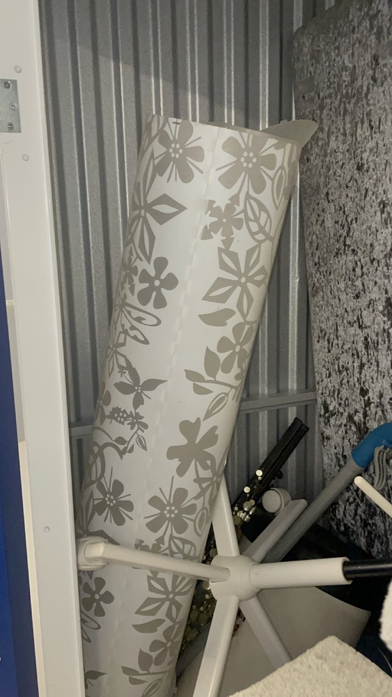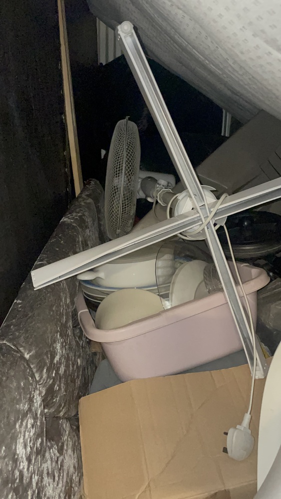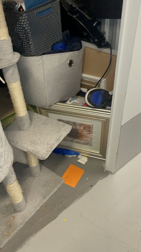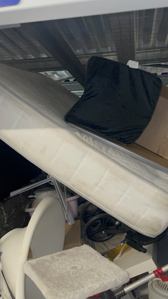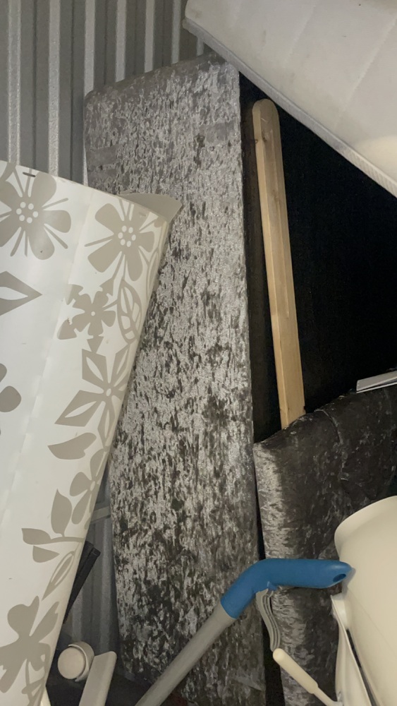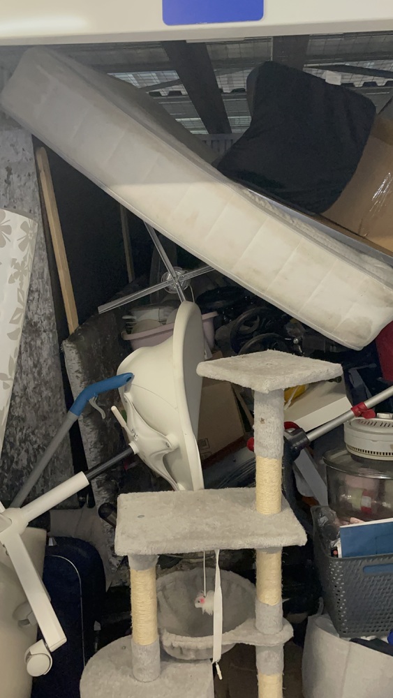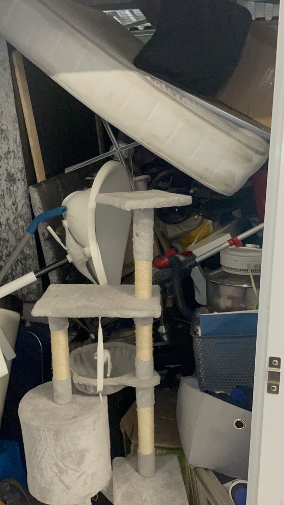 This 50 ft.² unit had one cat plate tree a baby highchair, various lamps, double mattress the van and headboard vacuum cleaner, wheelchairs, glass table, tall fan, and bags of unknown personal items