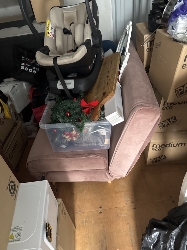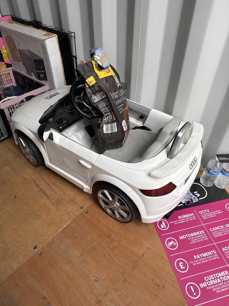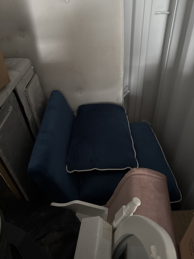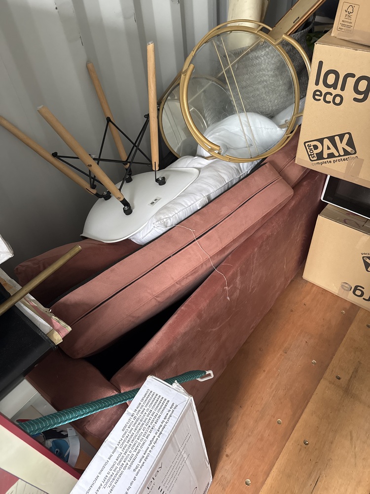 Auctioning the full contents of a storage container, sold as one lot. Items include a children’s ride-on vehicle, a white table with matching chairs, a pink fabric sofa along with a sofa bed, a Greg Duvan bed, and a small blue fabric chair. Contents appear suitable for home furnishing, resale, or refurbishment.