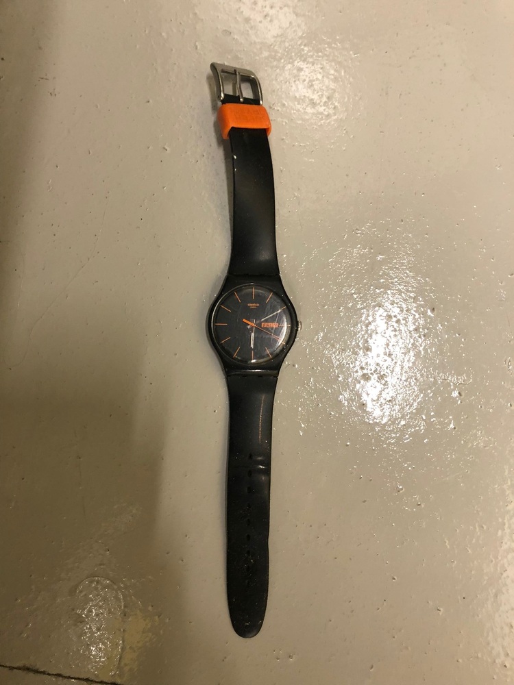 Swatch Swiss Watch: Swatch New Gent Dark Rebel, Model SUOB704 with black silicone strap and orange accent on buckle