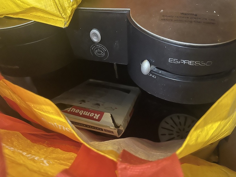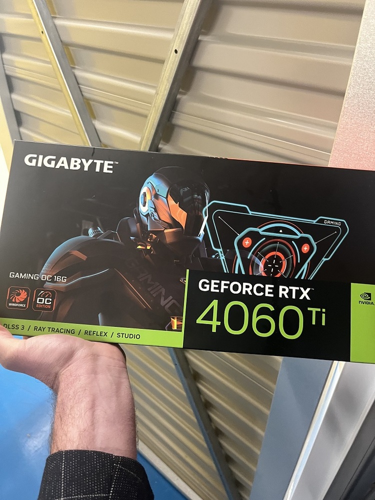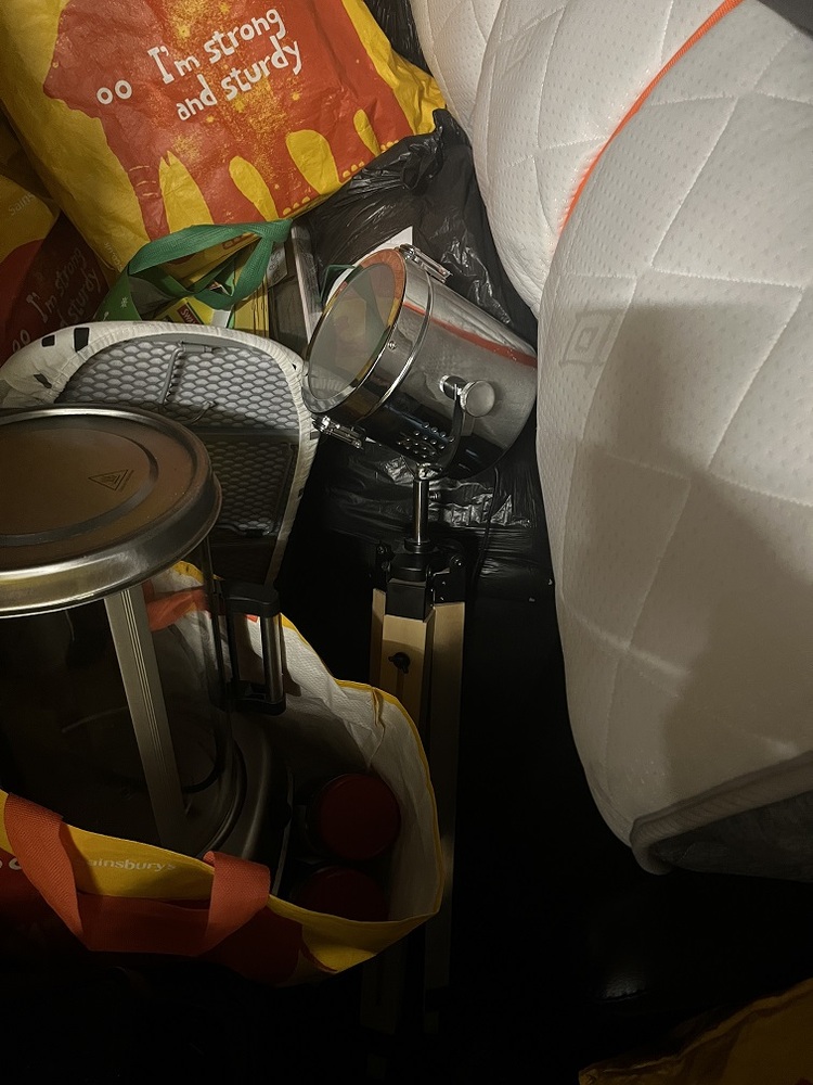 This 50 sqft unit contains a GE Force RTX 4060 GB ray-tracing gaming box, a Morphy Richards espresso coffee machine, a large food blender, and an air fryer. The unit also includes a leather-effect office chair, a comfortable double mattress, a floor lamp, and a 2500W tower double hot plate. Additional items include a folding camping table, a small hard-shell travel case, and various bags of household items.