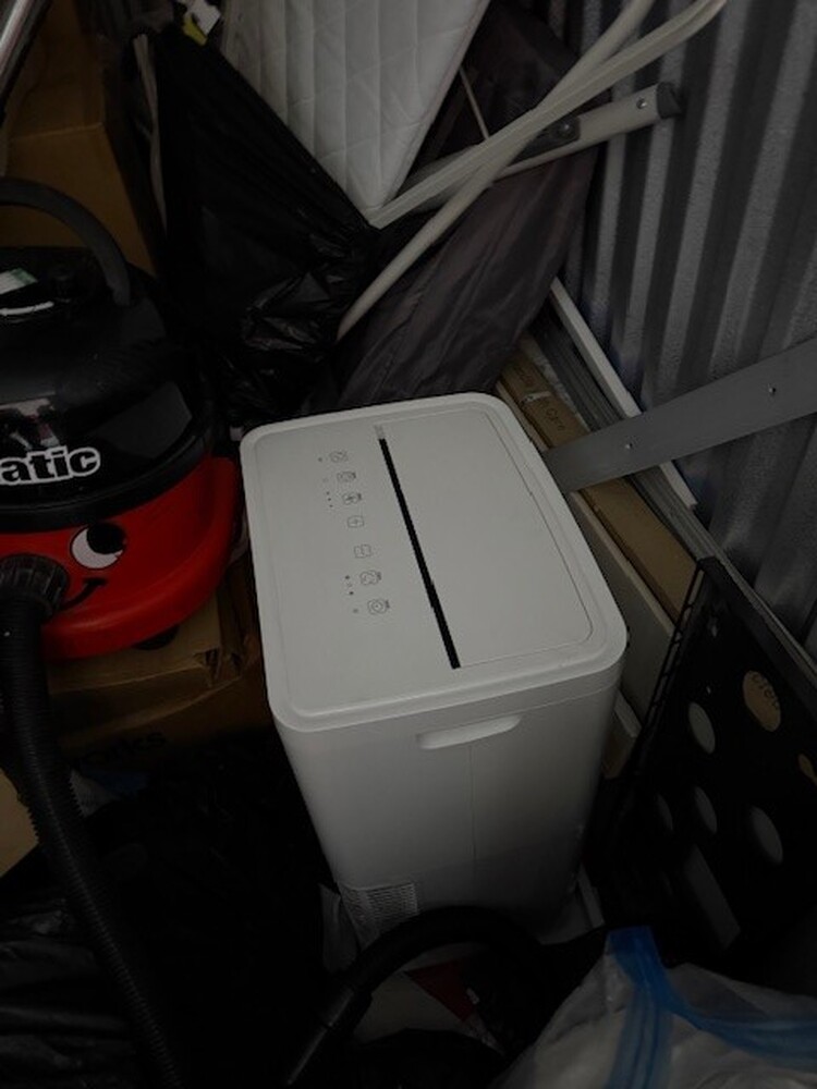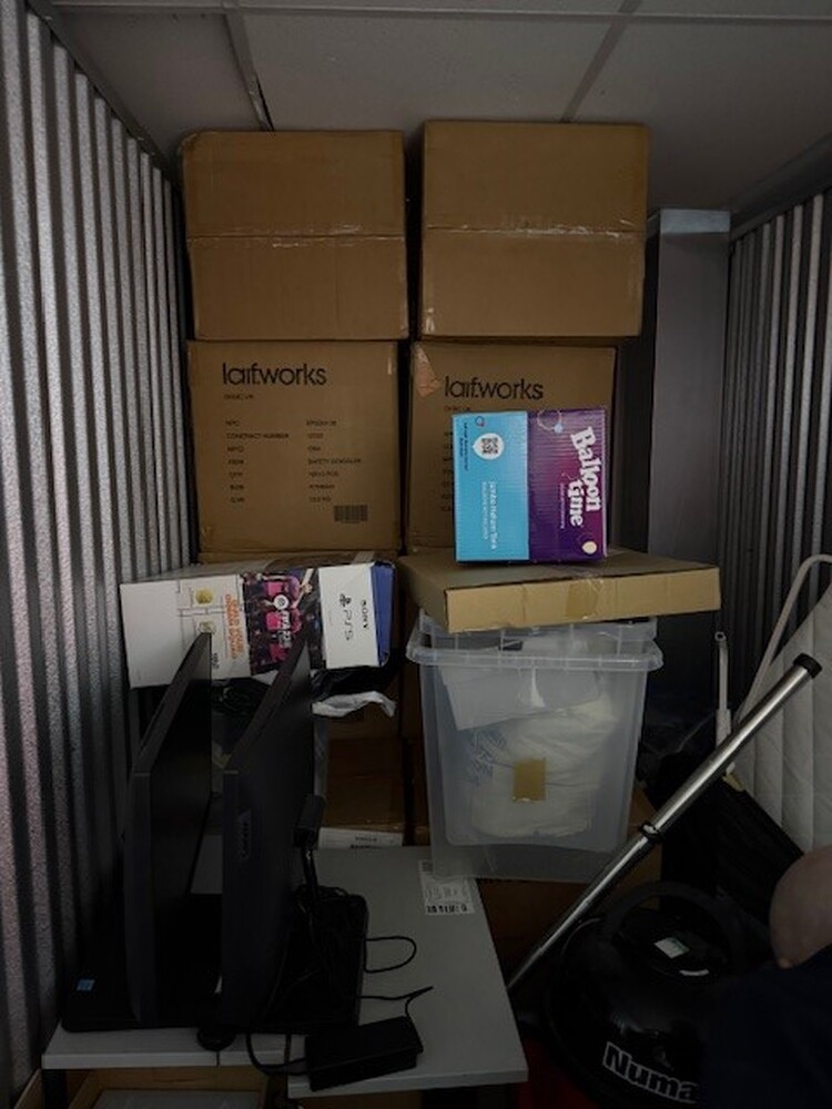 Unit has a henry hoover in, screens/monitors, a printer, a dehumidifier and many unmarked boxes toward the back of the unit.
