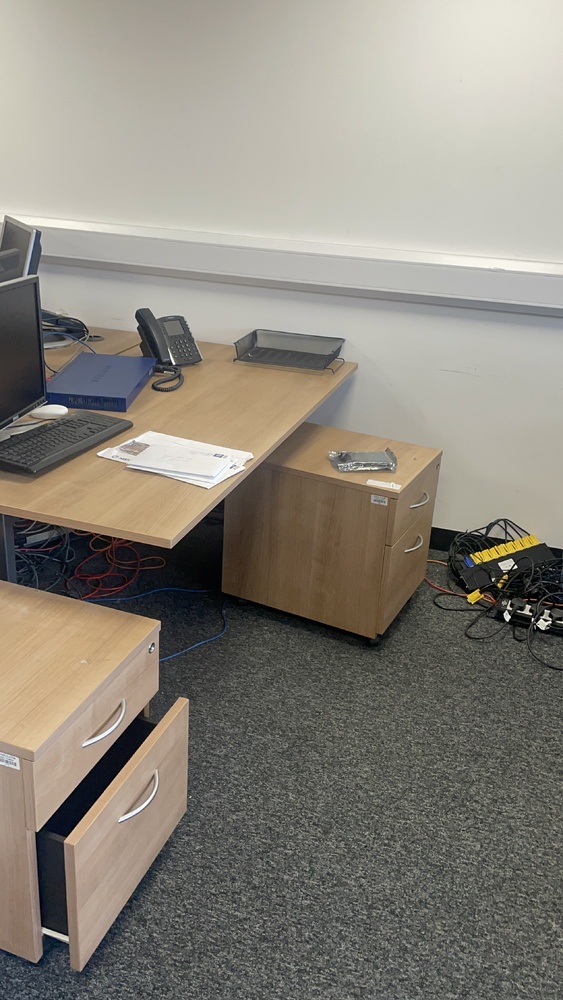 That’s 460 square-foot office has been left as the people are working on it so they are circa 10 dis 6 side tables 9 to 10 cheers 1314 computer screens, seven phones filing cabinet, full of phones and stationary small fridge. LabelMaker, a router as a storage cabinet, lots of cables books and a shredder
