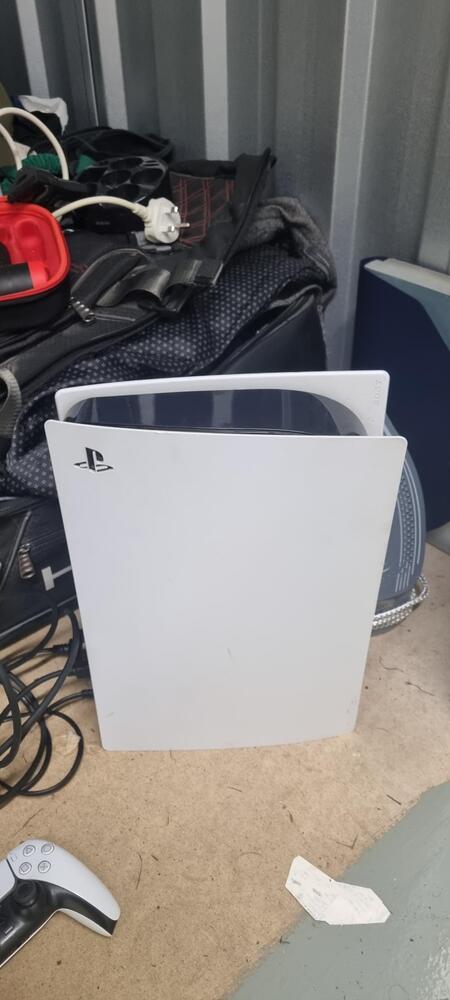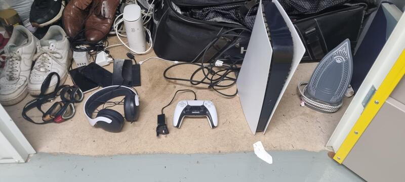 This unit is a small unit with clothes and 2 cases as seen along with a plasystation that has been plugged in and powered up.