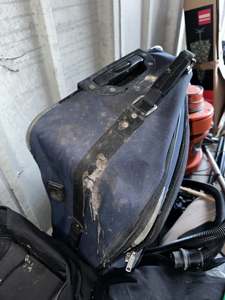 The items currently in the space are shown in the images and include a suitcase, boxes, bags, a vacuum (etc).