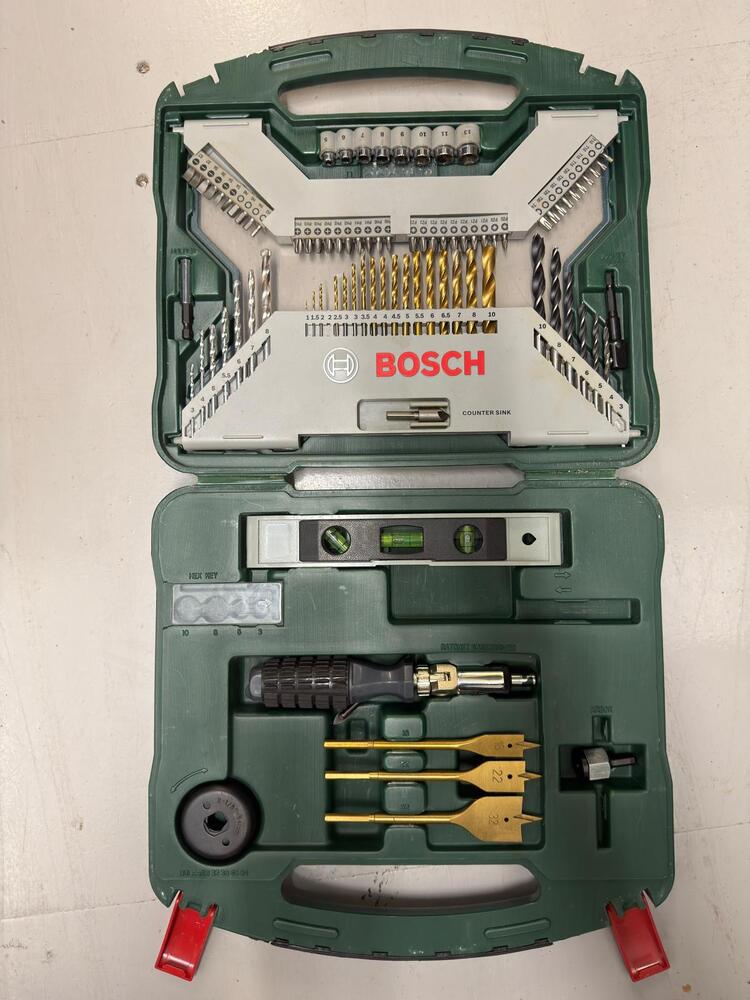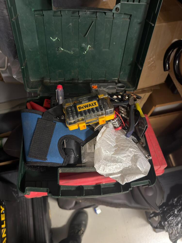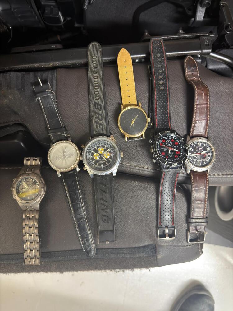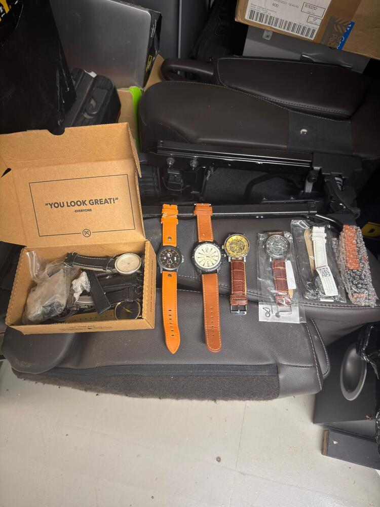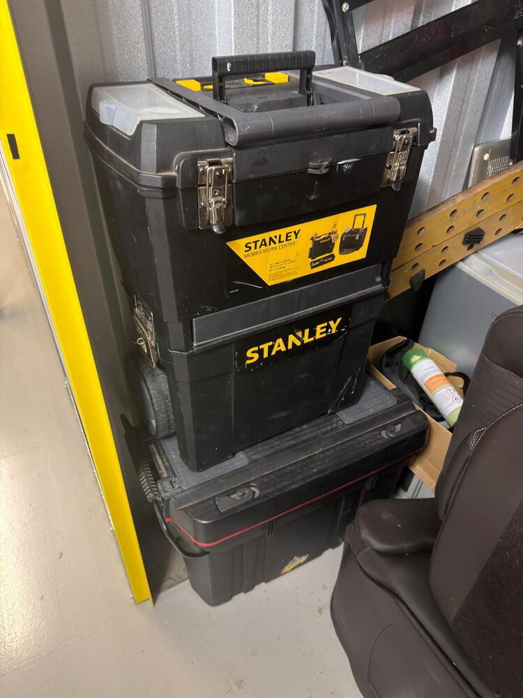 stanley mobile work centre, car seats heated, bosch tool piece set, old macbook, printer, desk chair, fridge Logik, box of miscellaneous watches.