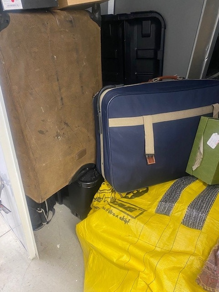 This is a ground floor 40 sq/ft room with mainly bags and suitcases of mens clothes and shoes. Also has a large american style fridge freezer , There are quite a few shoe boxes of designer brands but they are empty. Said shoes may or may not be in the bags and cases in the room.