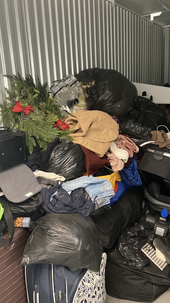 Several suitcases, lots of bags of clothes
