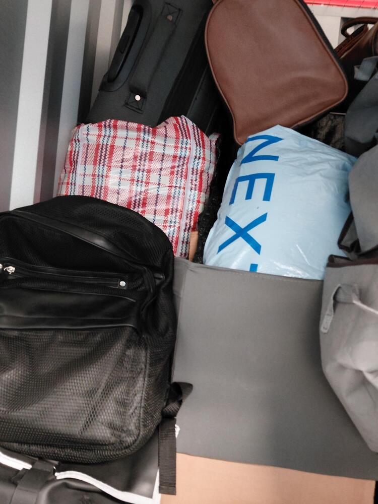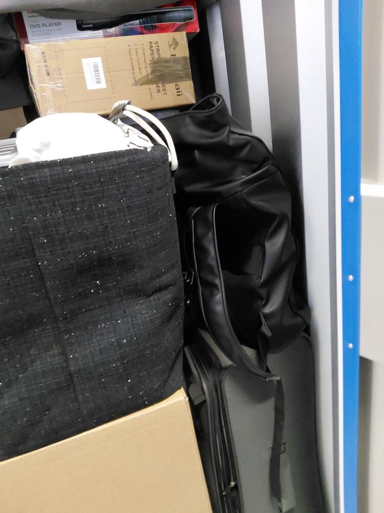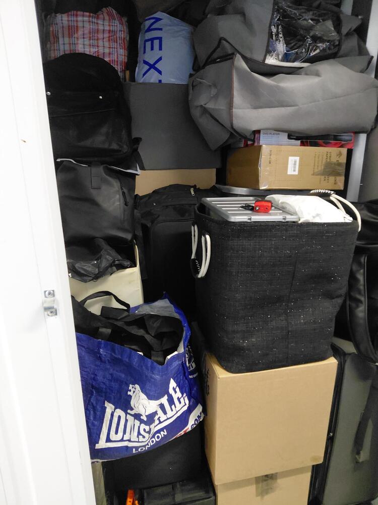 A unit full of a variety of boxes, lidded plastic tubs, holdalls, rucksacks and bags, with contents unknown