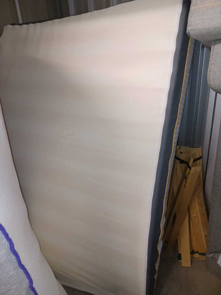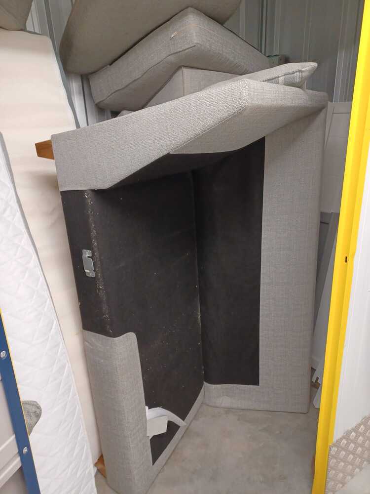 WHITE WOODEN TABLE, CREAM CURTAINS, BOX OF KITCHEN UTENSILS, GREY CORNER SOFA, WHITE DOUBLE BED FRAME, GREY SINGLE BED FRAME, DOUBLE MATTRESS, SINGLE MATTRESS.