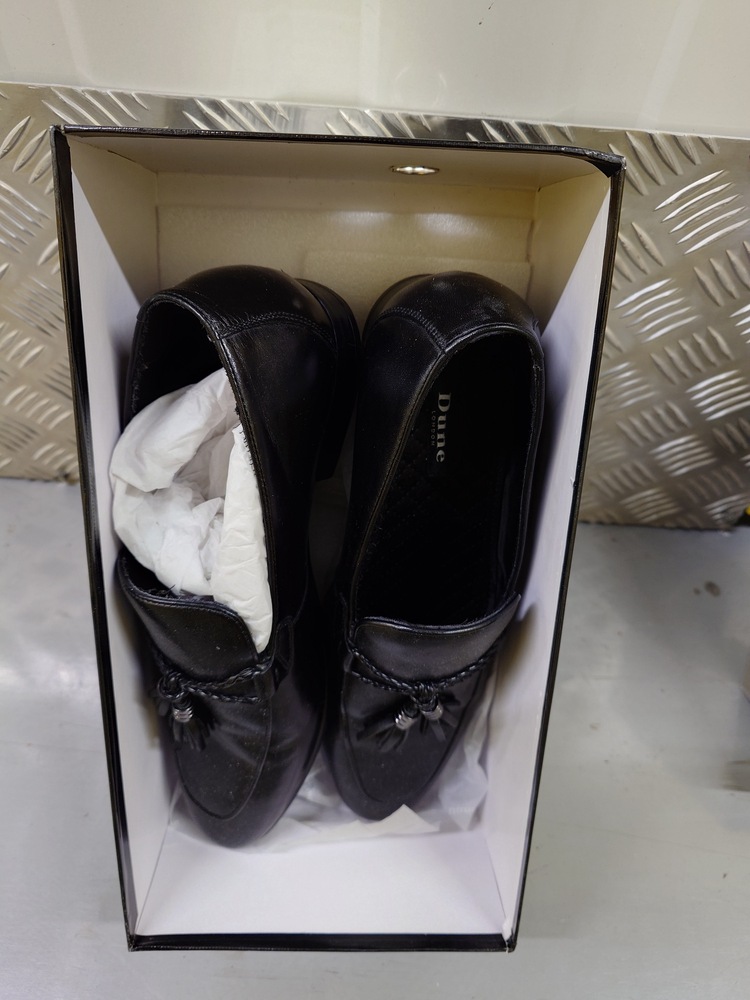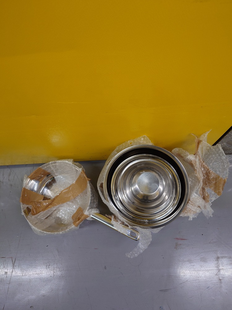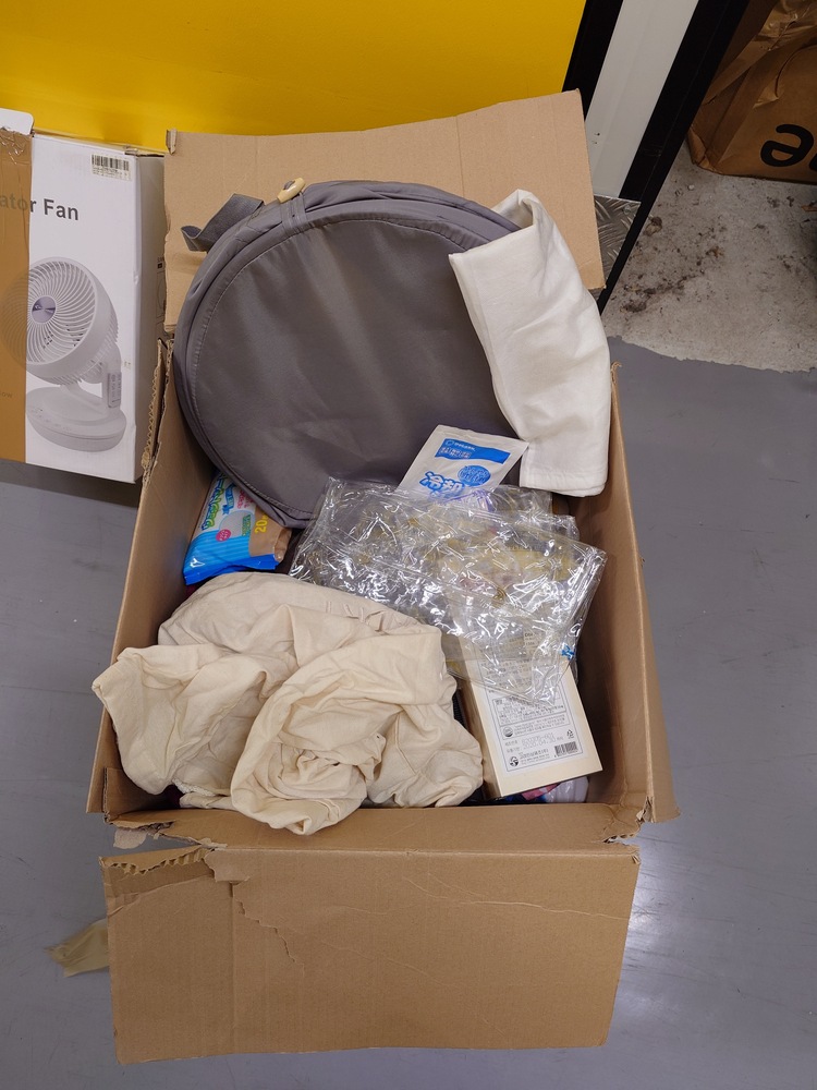 A room with mostly household items, including some sauce pans a box of man's shoes and a box of unidentified items