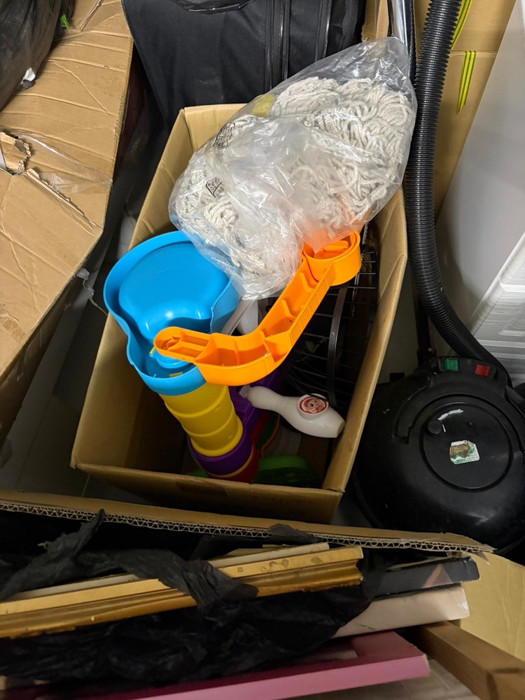 Bags of clothes, lots of bags, washer or dryer, hoover, boxes, personal effects to be removed