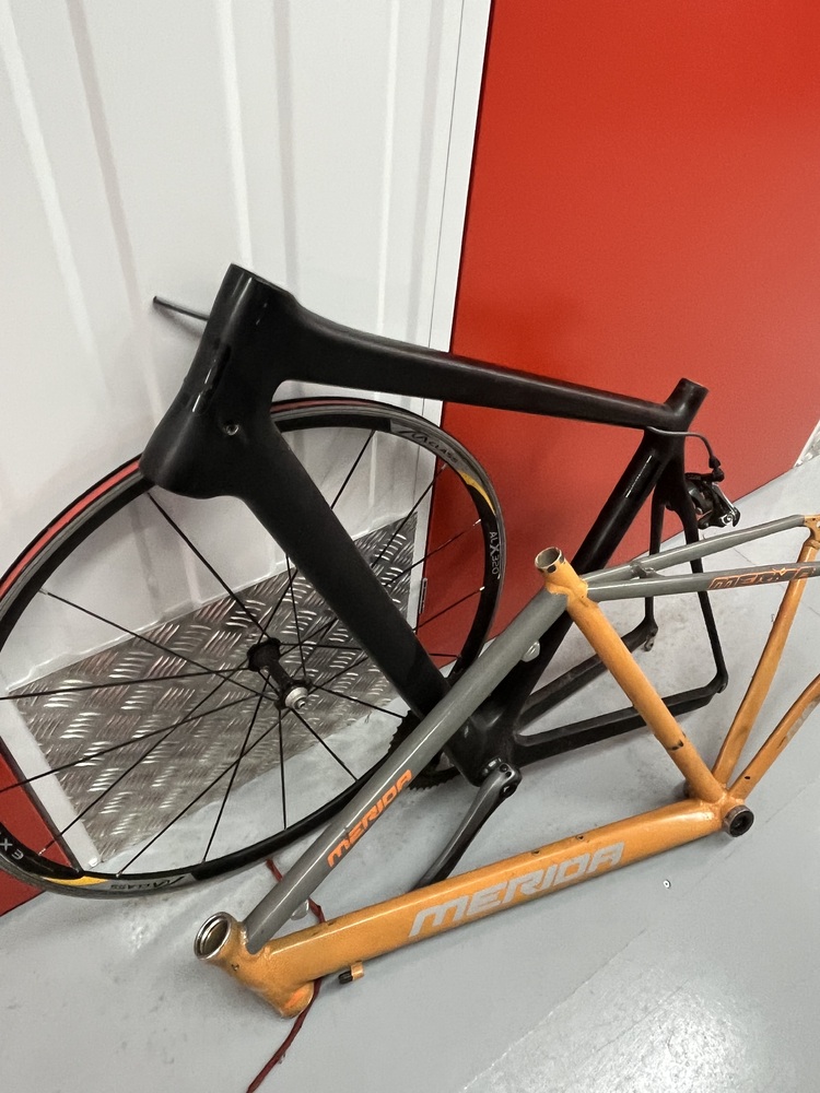 Orange and grey “Merida” bicycle frame