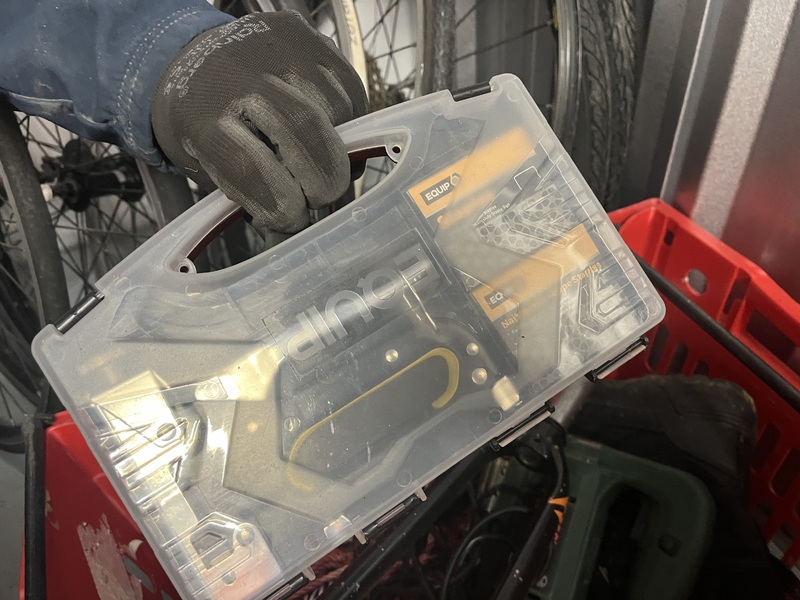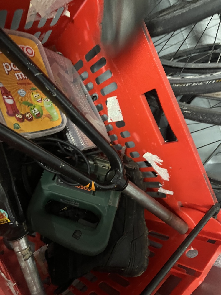 Red crate containing a “Bosch” jigsaw, bicycle parts and a heavy duty stapler.