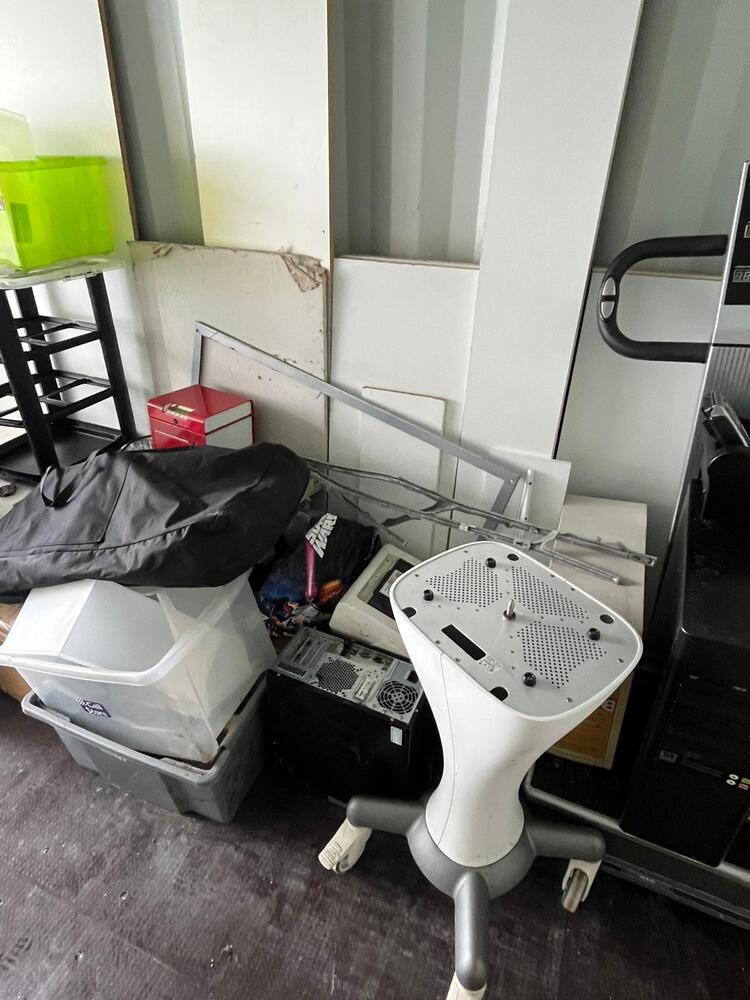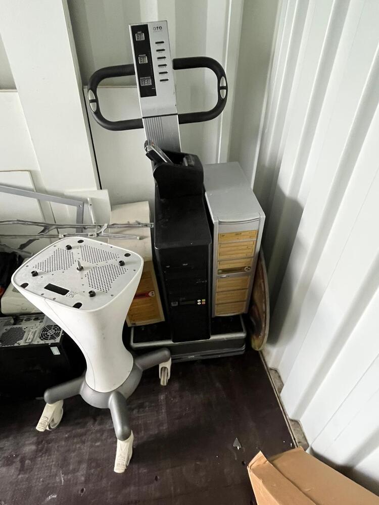 Container with assorted items including: CD/DVD players, computers, card machine, cardboard & plastic boxes, storage towers, bags, machinery/tool boxes, suitcases, glass panels, other assorted materials. Please see the photos for the extent of the contents.