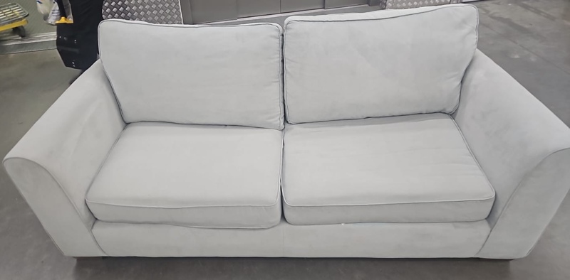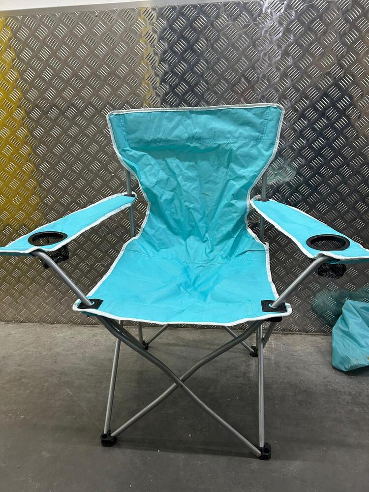 2 seater grey suede sofa, 1 white bathroom cabinet and a TV unit, 2 bar stools, painting, 2 camping folding chairs