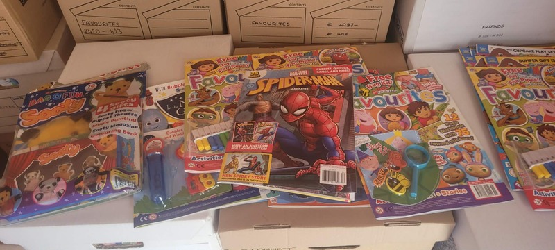 contents of x1 20 foot shipping container containing 536 boxes of assorted childrens magazine's including titles such as pepper pig spider man marvel heros post man pat fireman sam thunderbirds and disney princess plusmore.