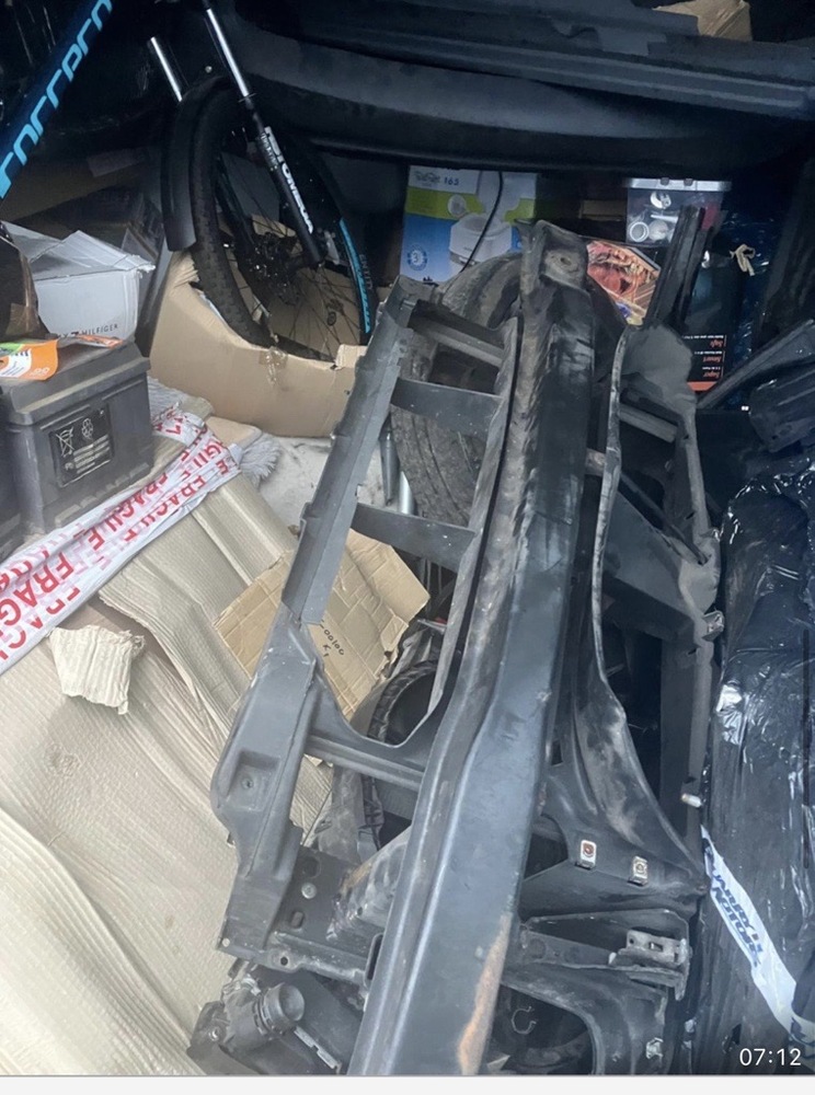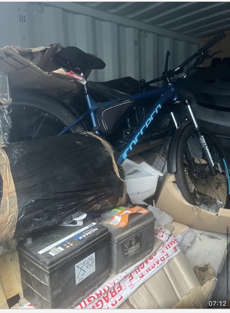 Contains various car parts, engine components, car batteries, a mountain bike, porta potty, a boxed air fryer, microwave, fridge, various boxes. Cannot confirm if electronics work.