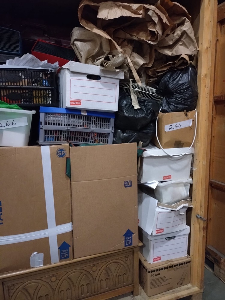 Storage unit with various items. There seem to be some furniture items and plenty of boxes