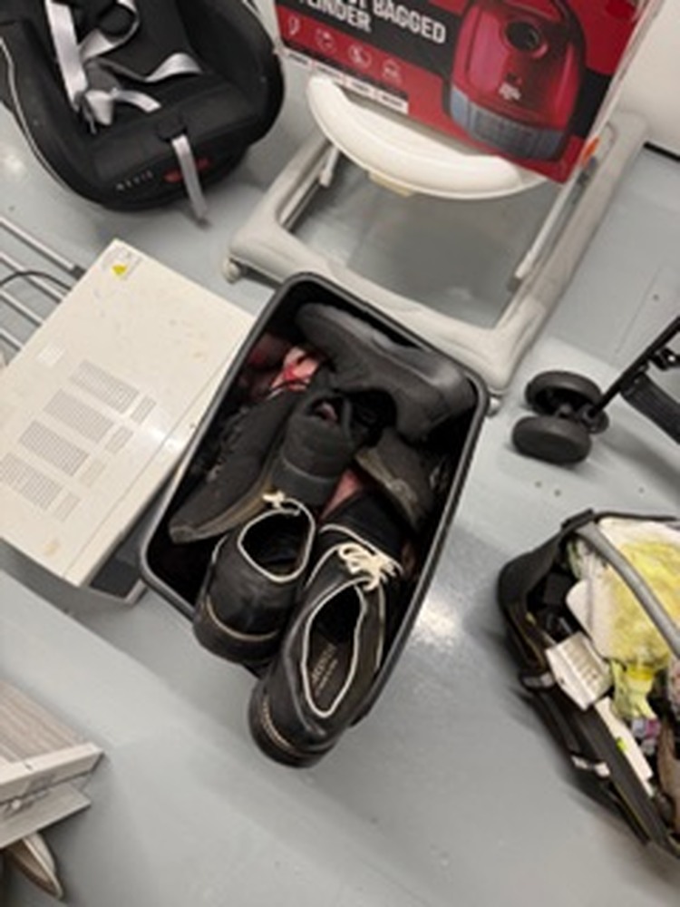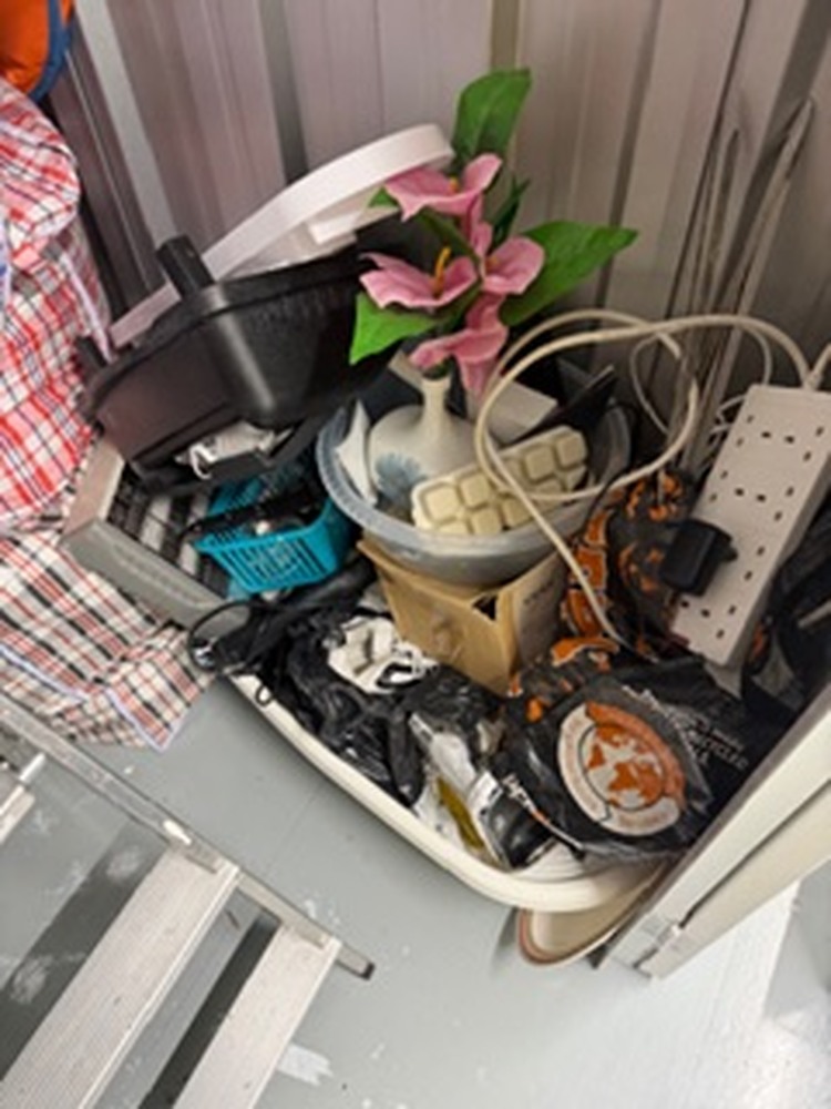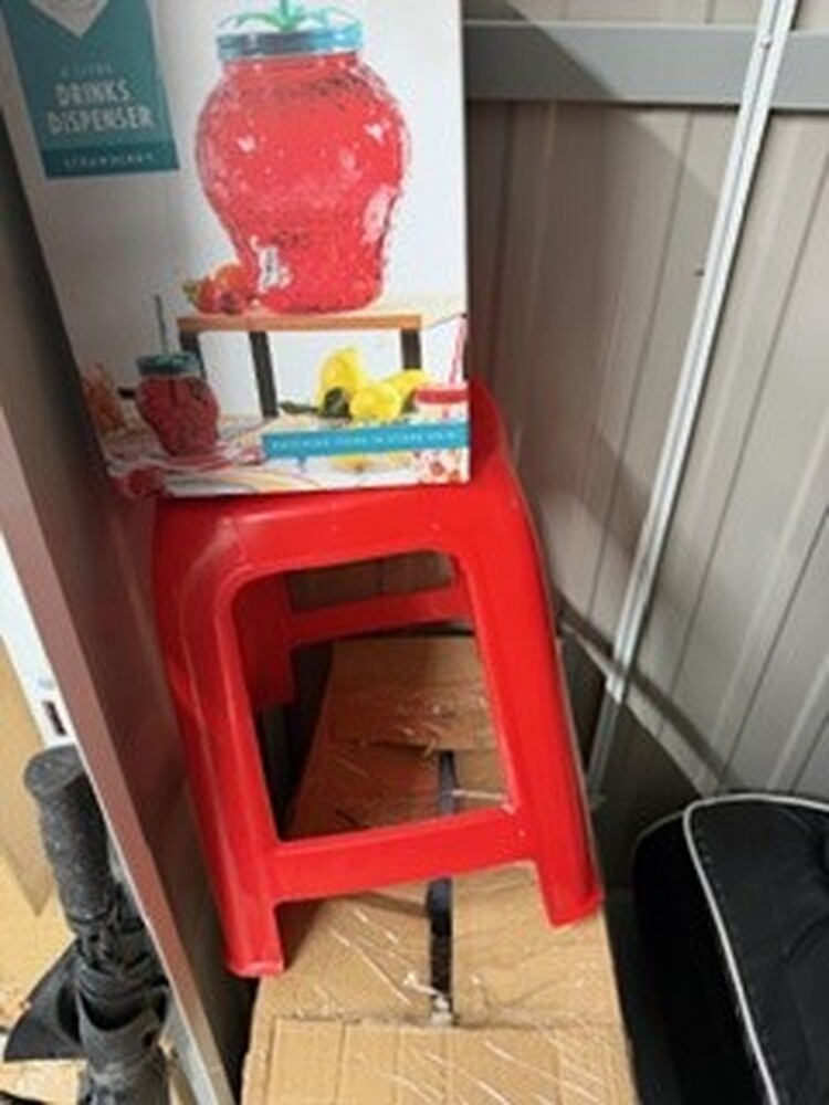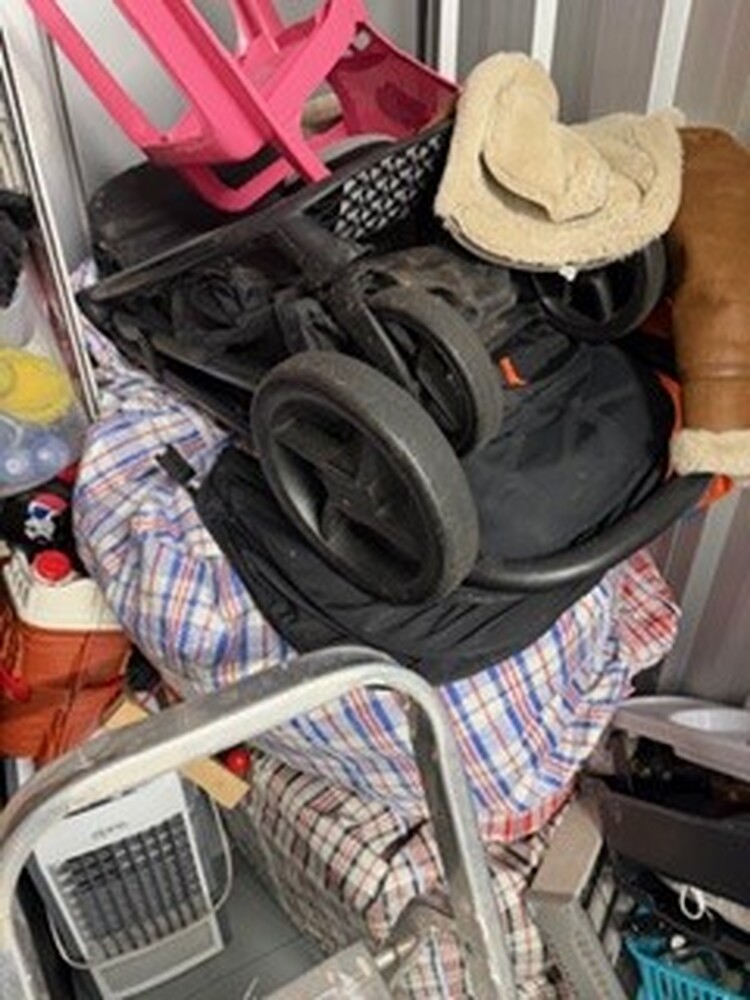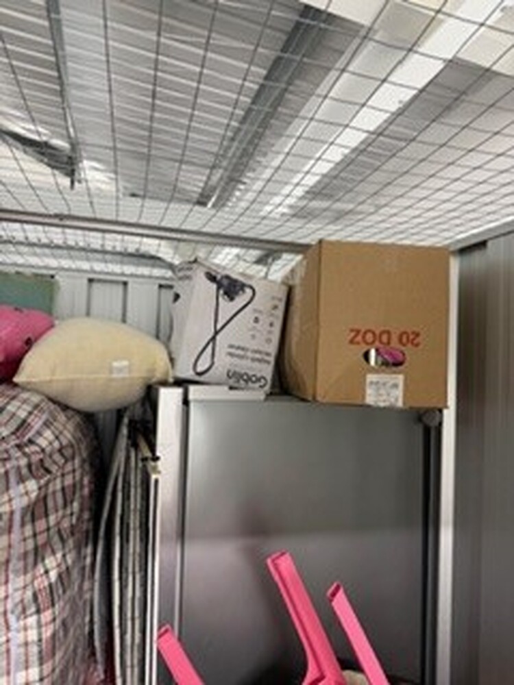 Small unit containing child's toys, pushchair, buggy, car seat, kitchenware, fridge freezer, microwave, vacuum, sewing machine, bedding and pillows, assorted footwear, humidifier, tools, ladder, and small miscellaneous items.