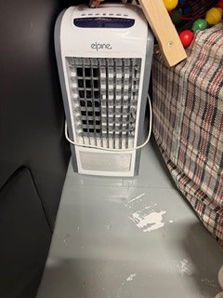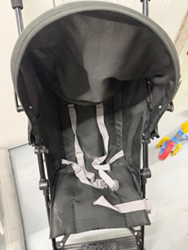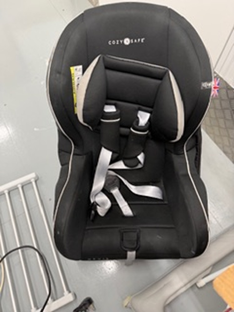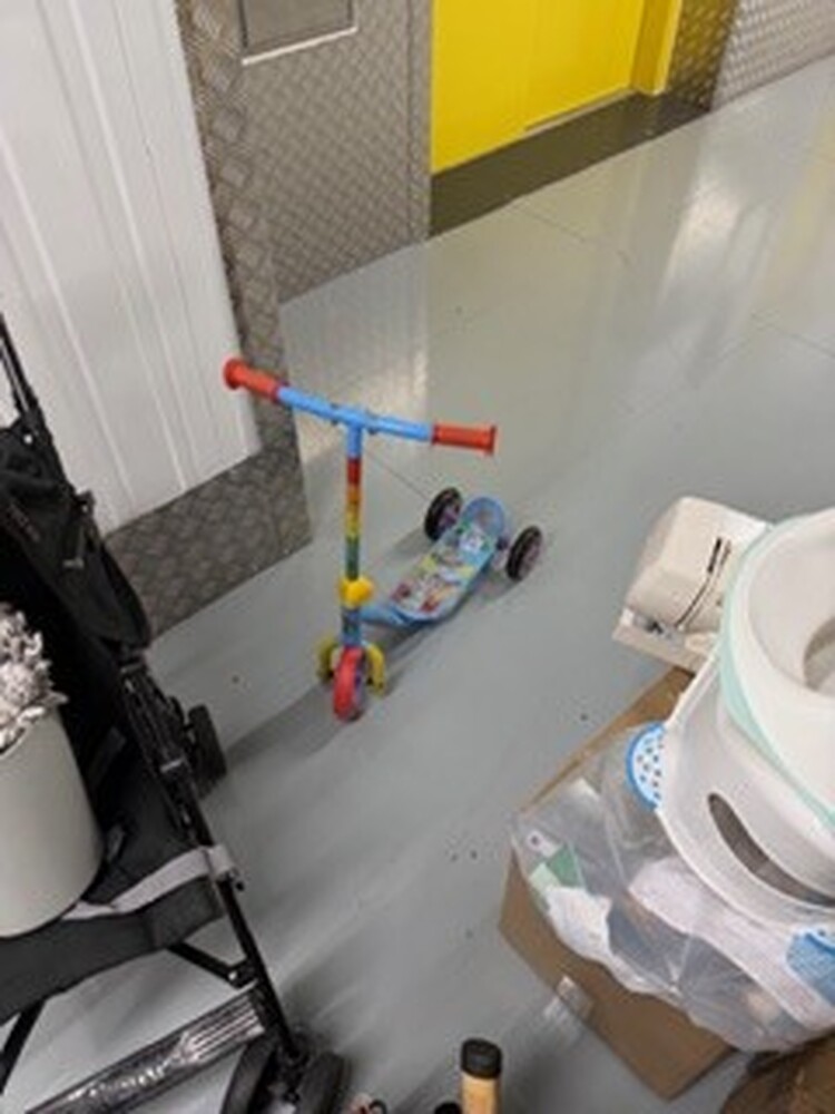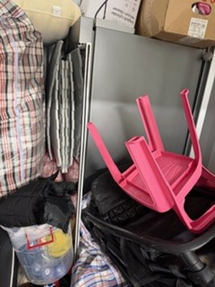 Small unit containing child's toys, pushchair, buggy, car seat, kitchenware, fridge freezer, microwave, vacuum, sewing machine, bedding and pillows, assorted footwear, humidifier, tools, ladder, and small miscellaneous items.