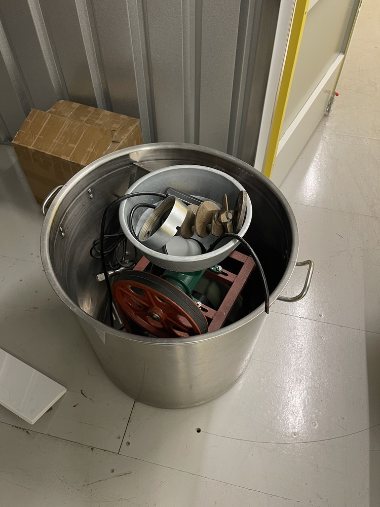 6. Large stock pot, with a belt driven mincer (?) inside