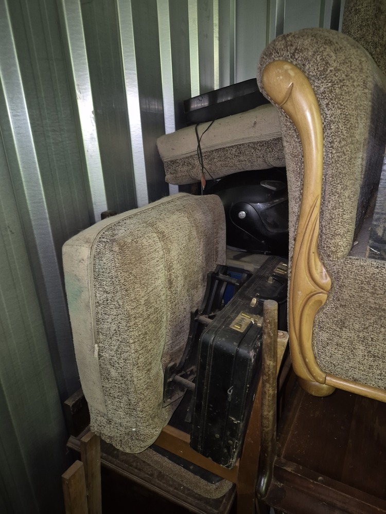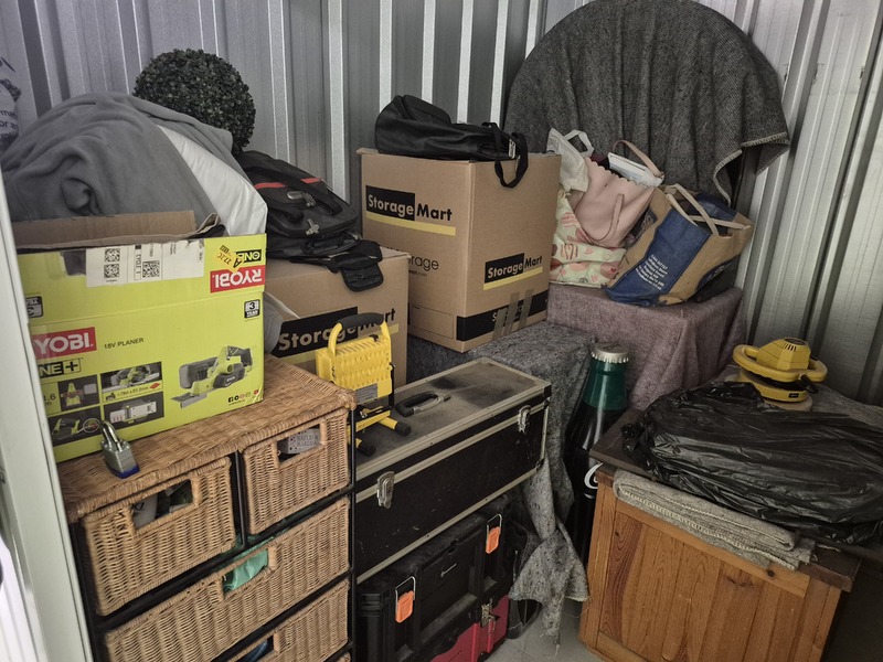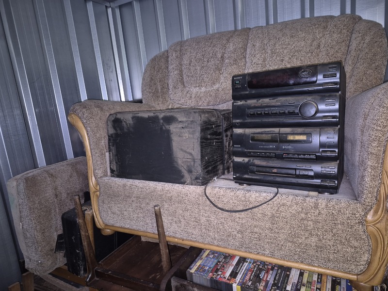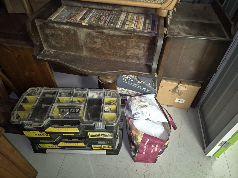 Unit appears to contain tool boxes, chest of draws and other wood furniture, stereo system, sofa, suitcase, chairs, dvd's, moving boxes and blankets.