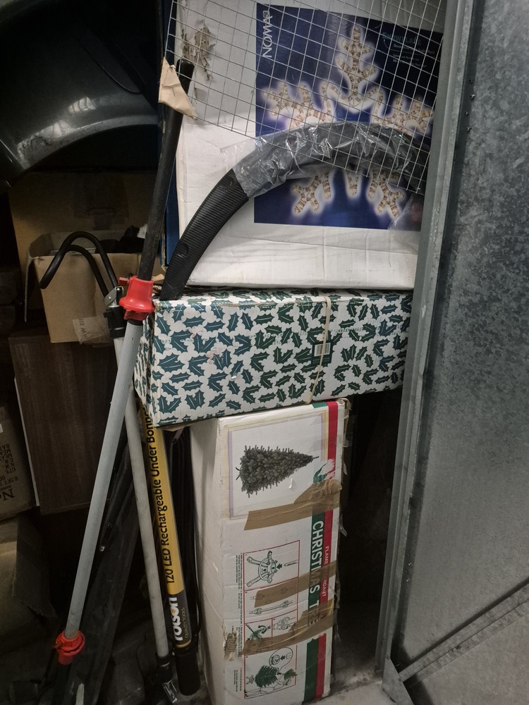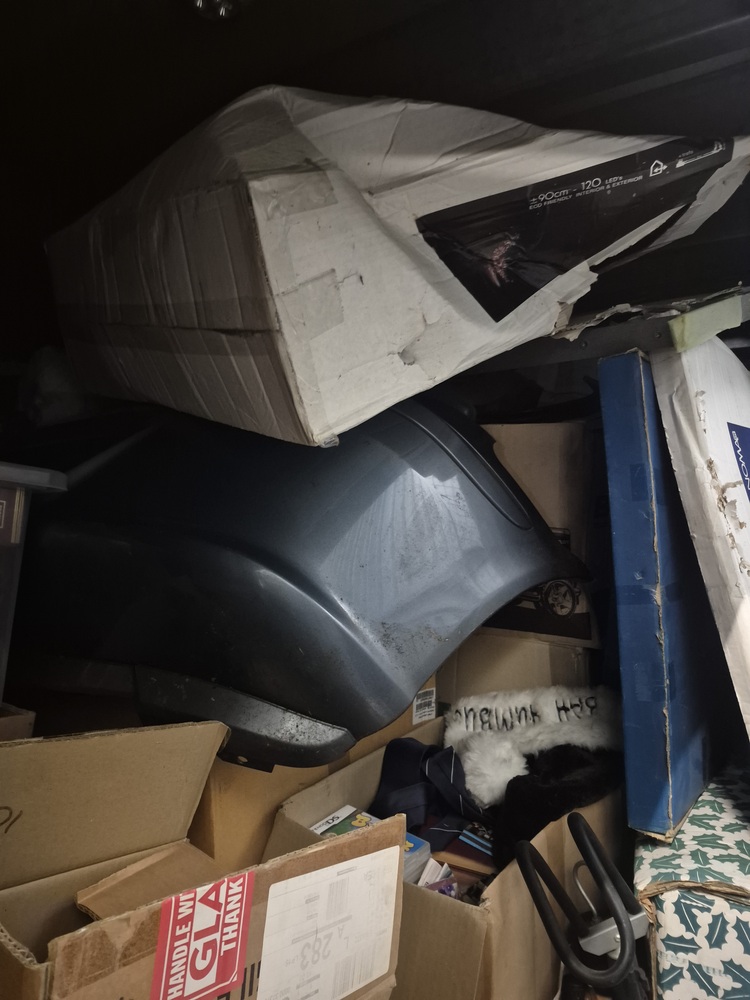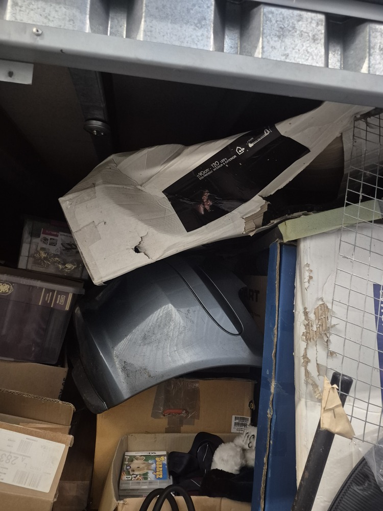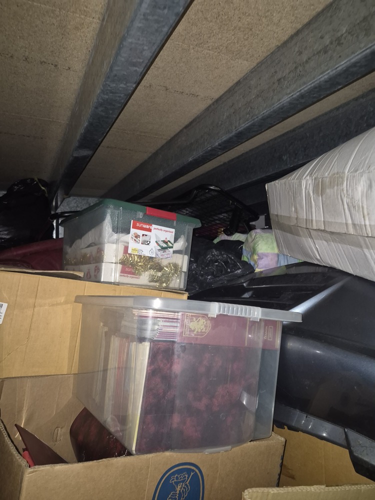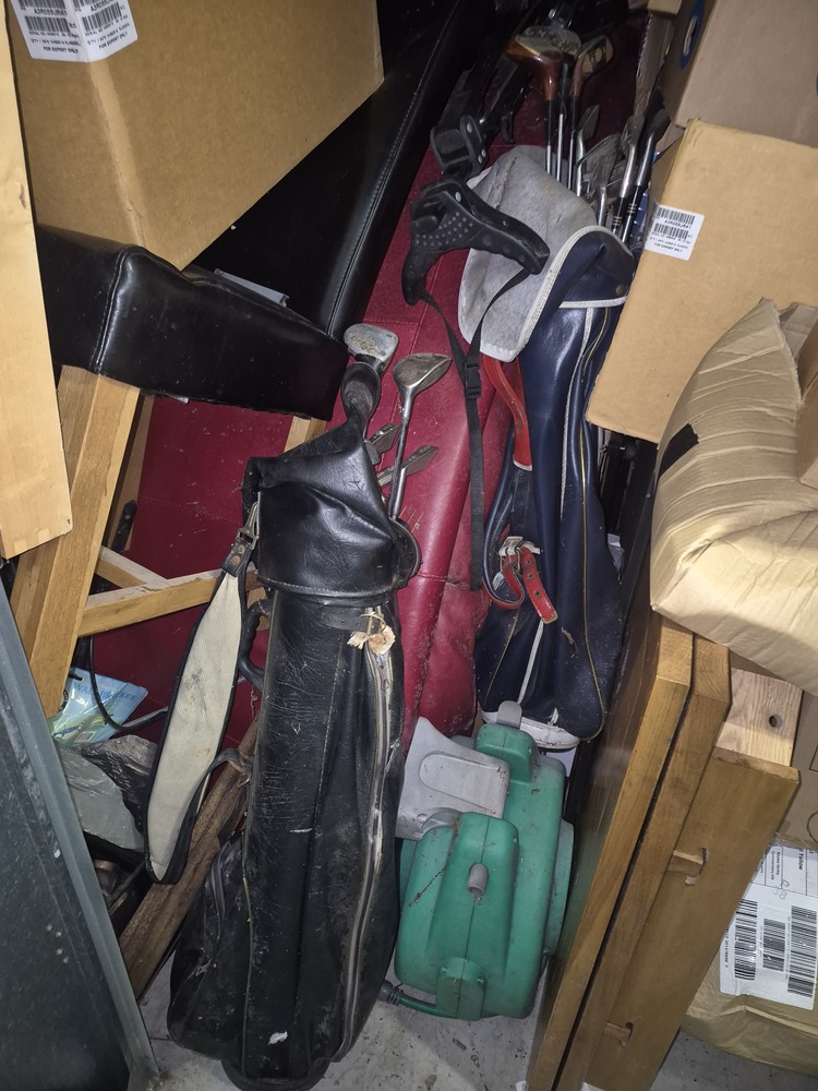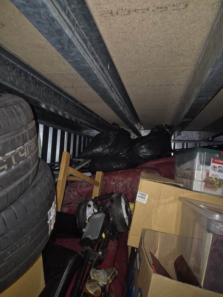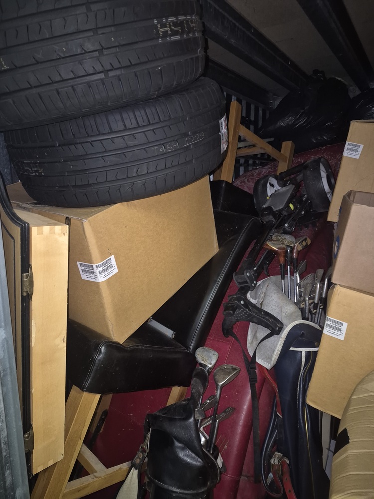 Unit appears to contain tyres, car parts, tools, hoover, golf clubs, Christmas decorations, video games, furniture, TV and other items that aren't visible.