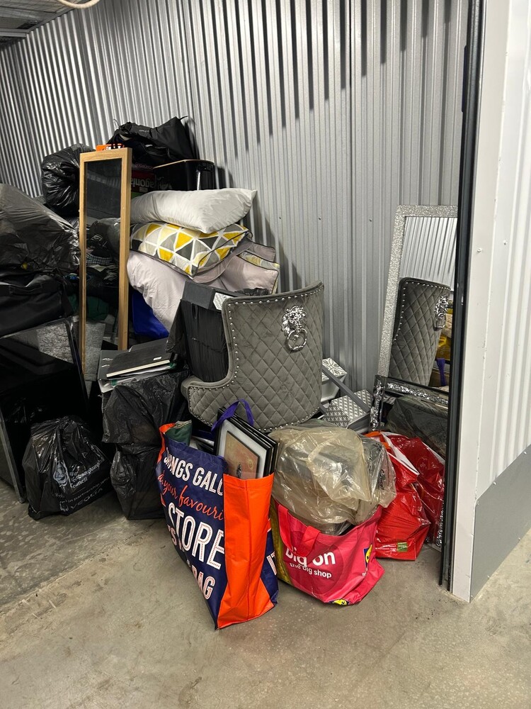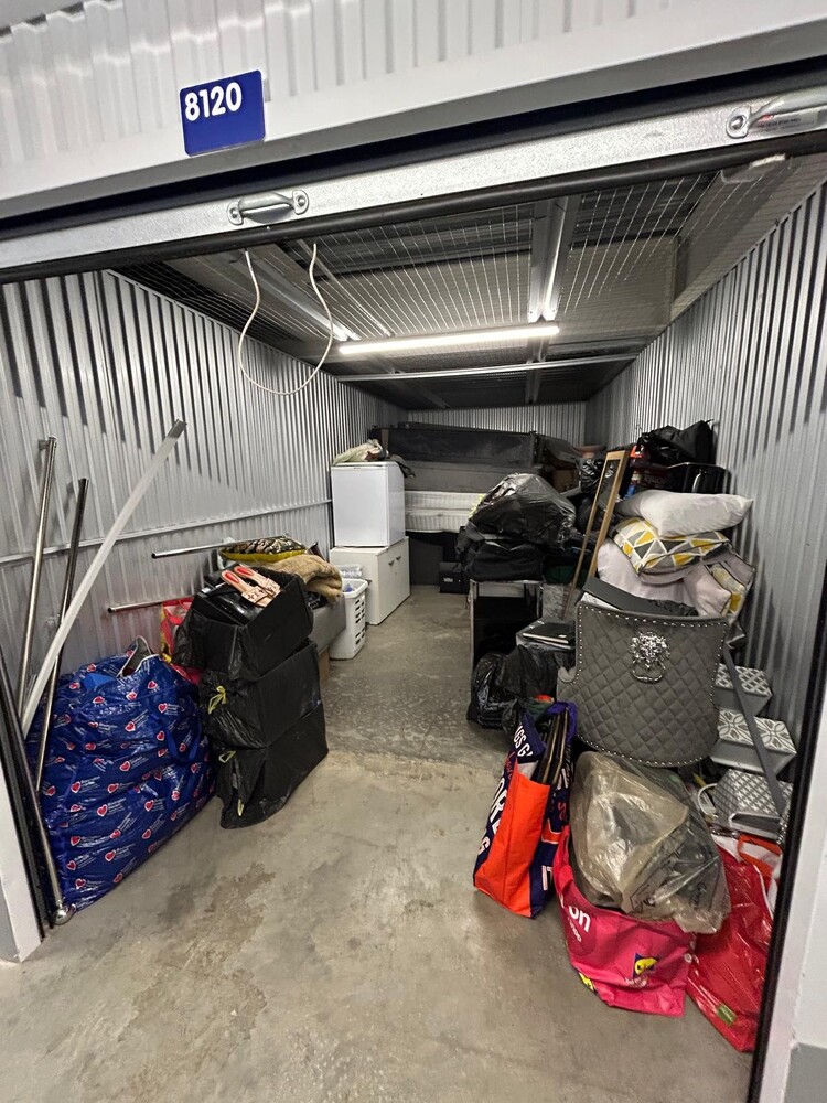 Large 200sqft unit packed with mixed household items including furniture, storage units, mirror, bedding, bags and electrical items.