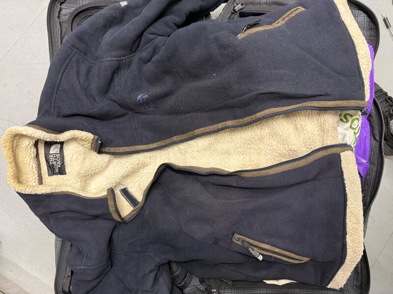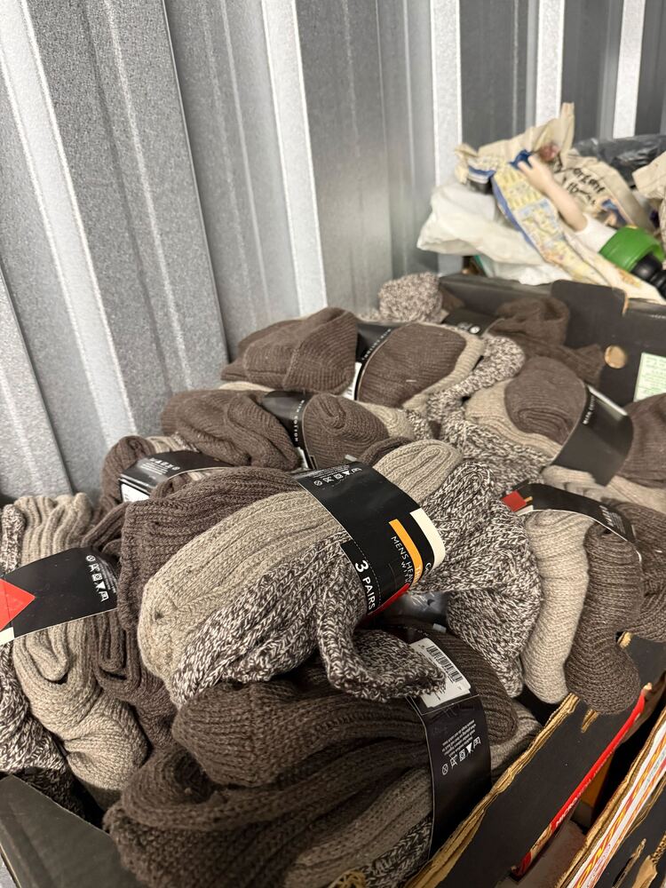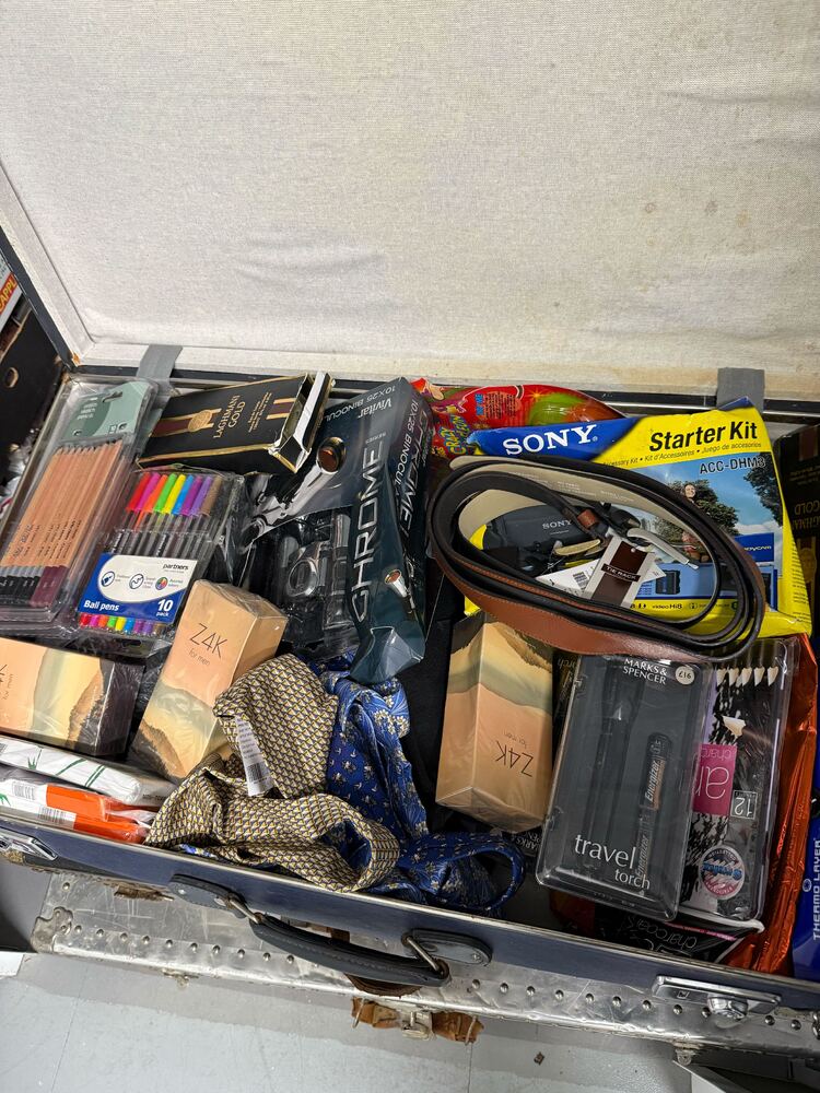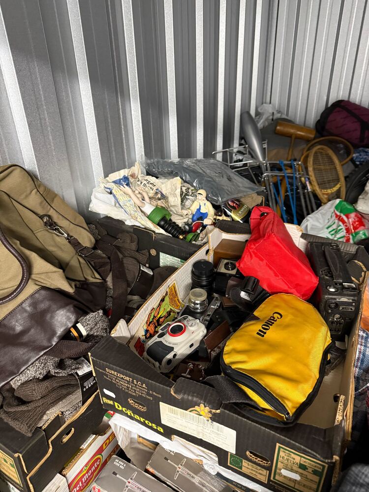 Contents of a packed storage unit available for sale, featuring a wide variety of items including cameras, clothing, accessories, retail stock, and miscellaneous goods.