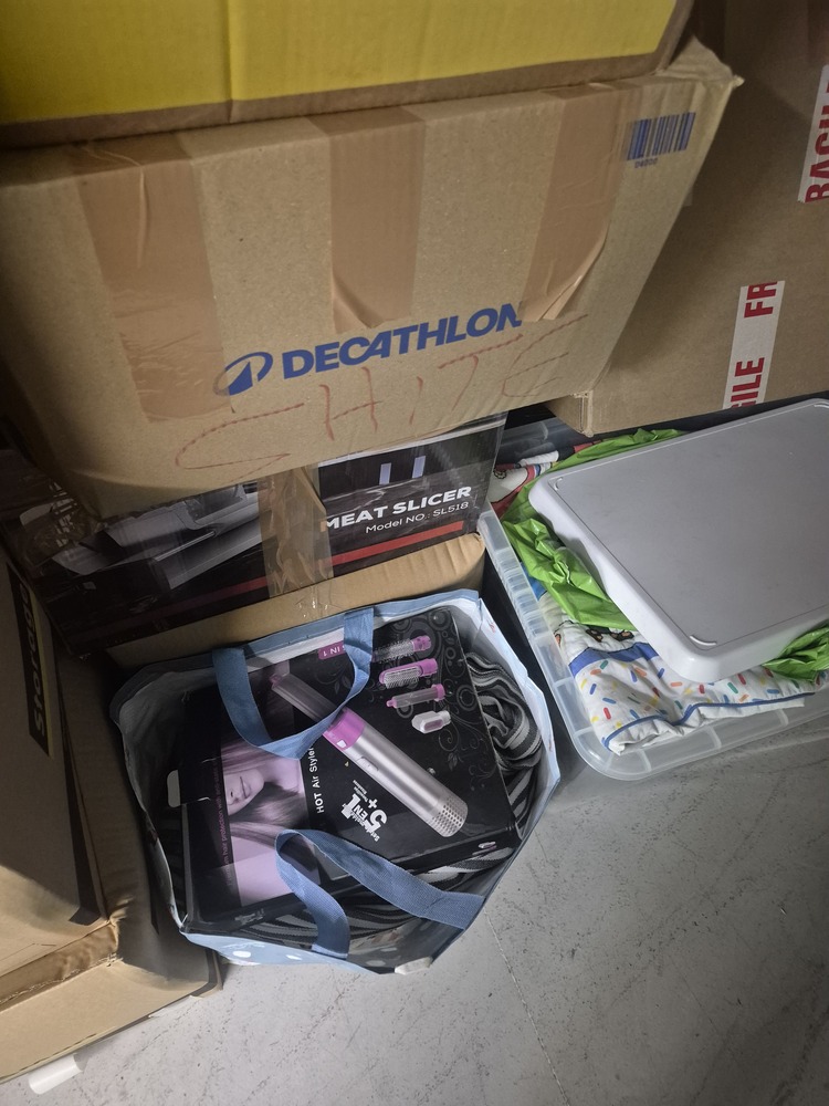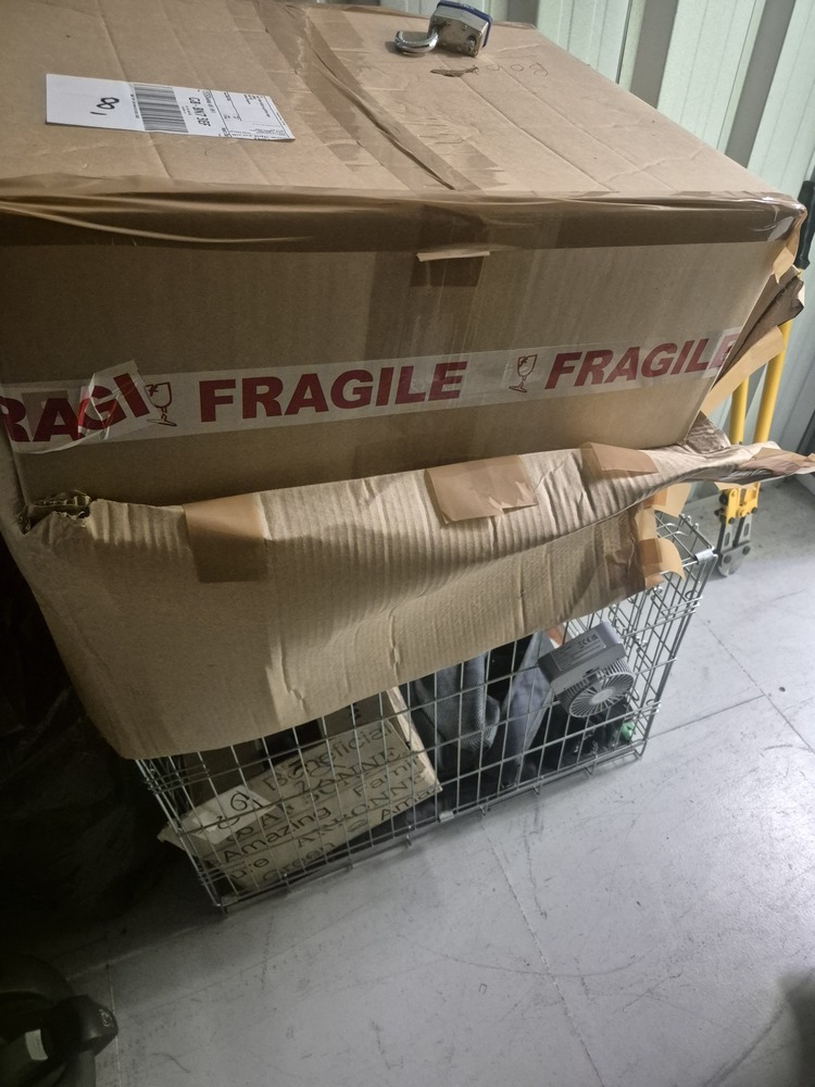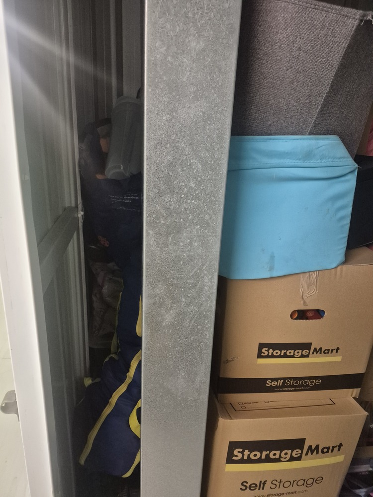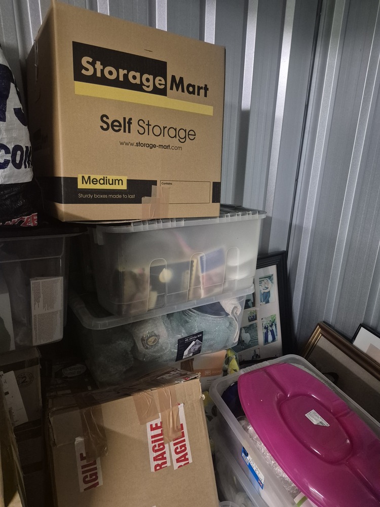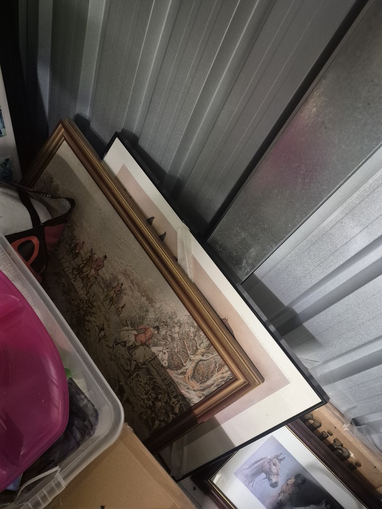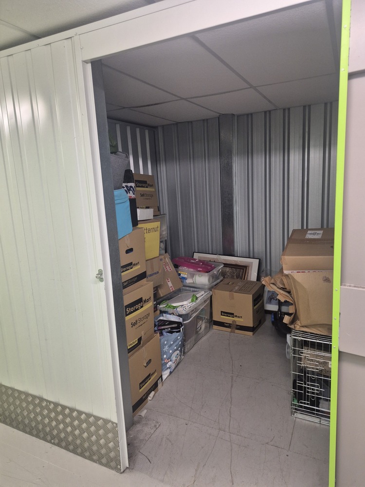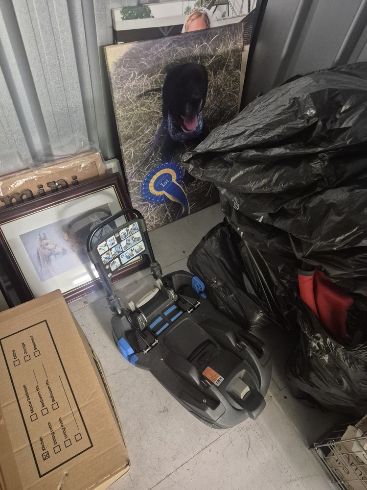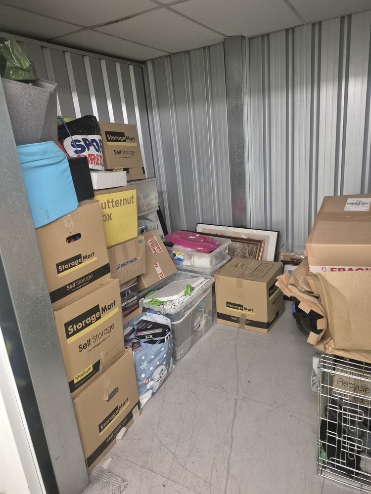 Unit appears to contain boxes, pictures, a large animal cage, childs car seat, china. There's likely other items that aren't in view.