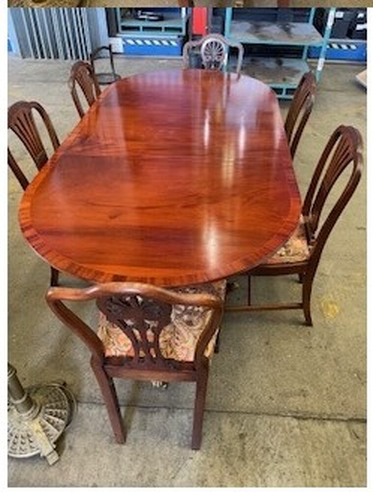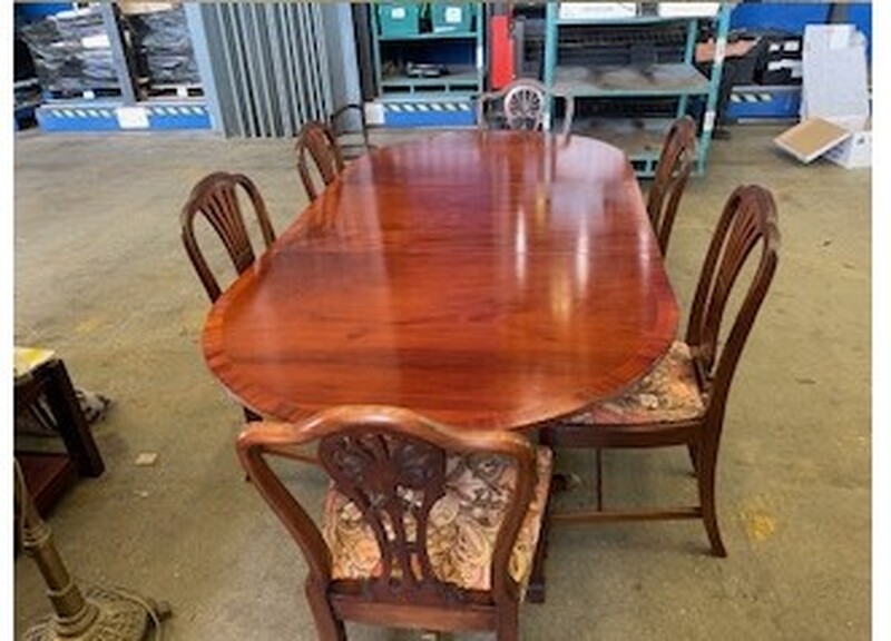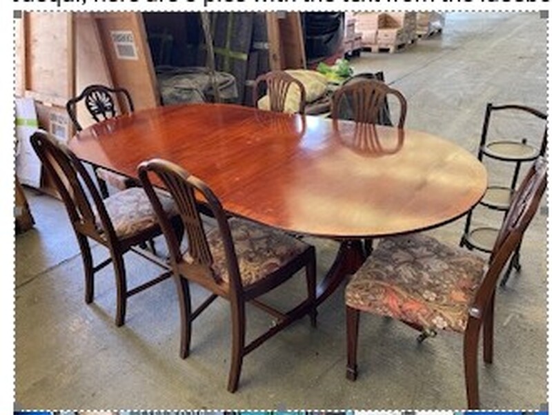 Container contains a beautiful rosewood dining table and six chairs and has an optional middle extension leaf to accommodate eight people comfortably. Six William Morris upholstered dining chairs (c1930’s). Table is on two decorative pedestals with castors.