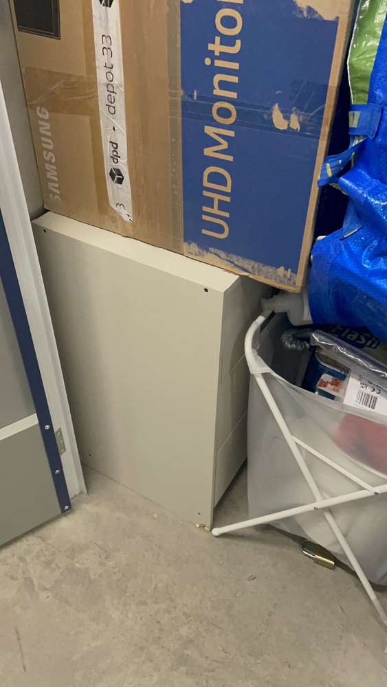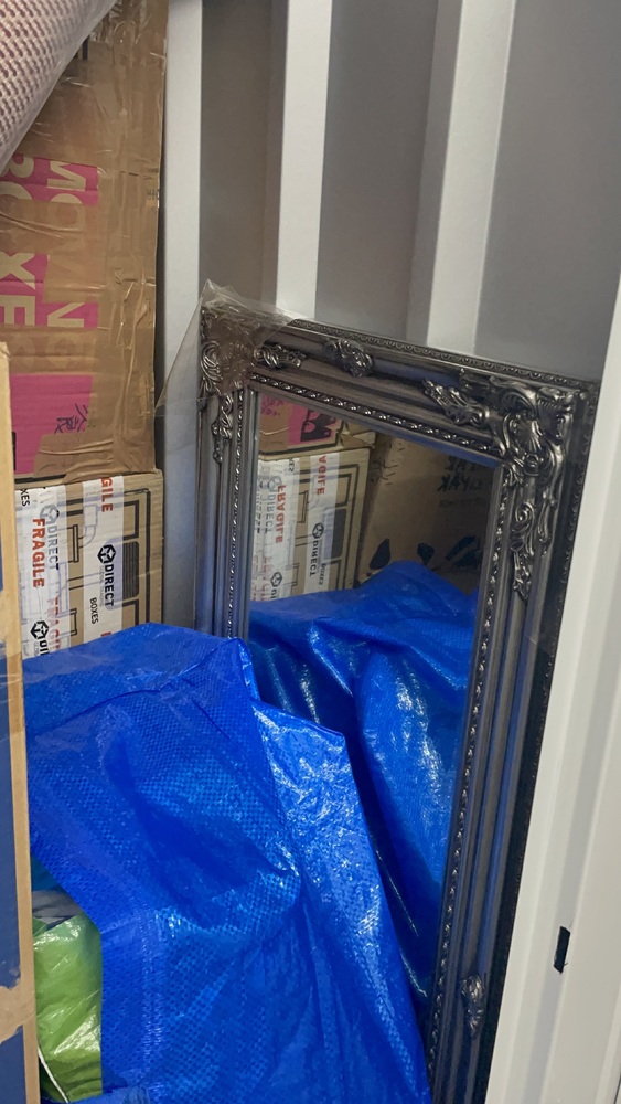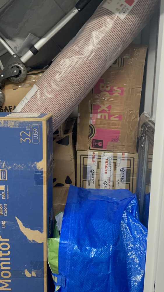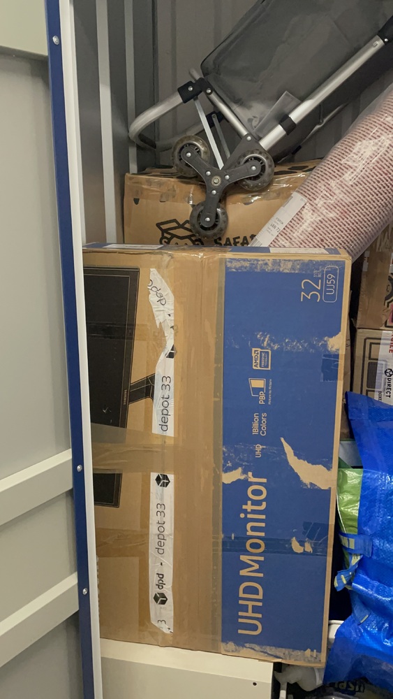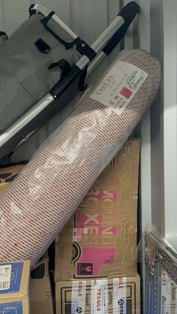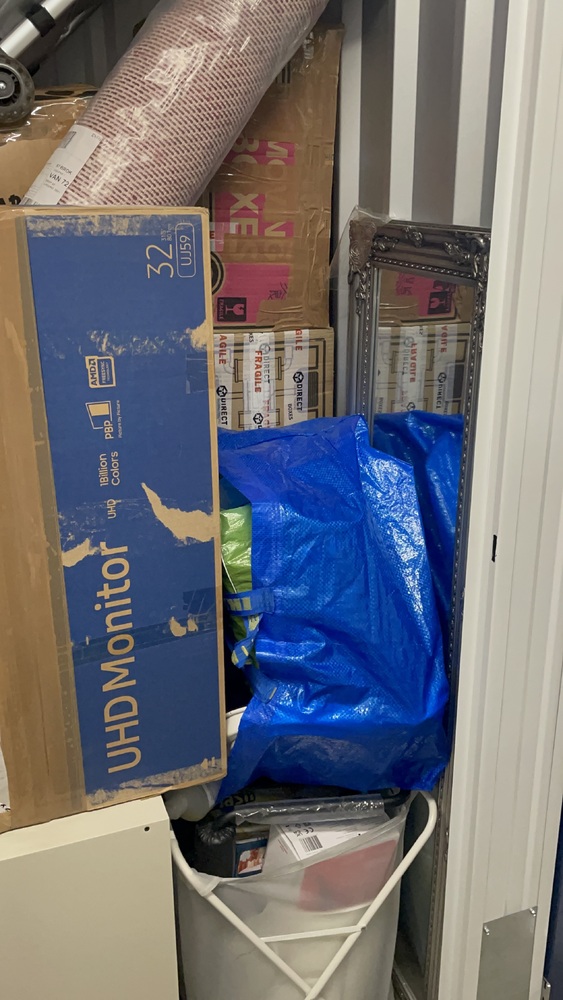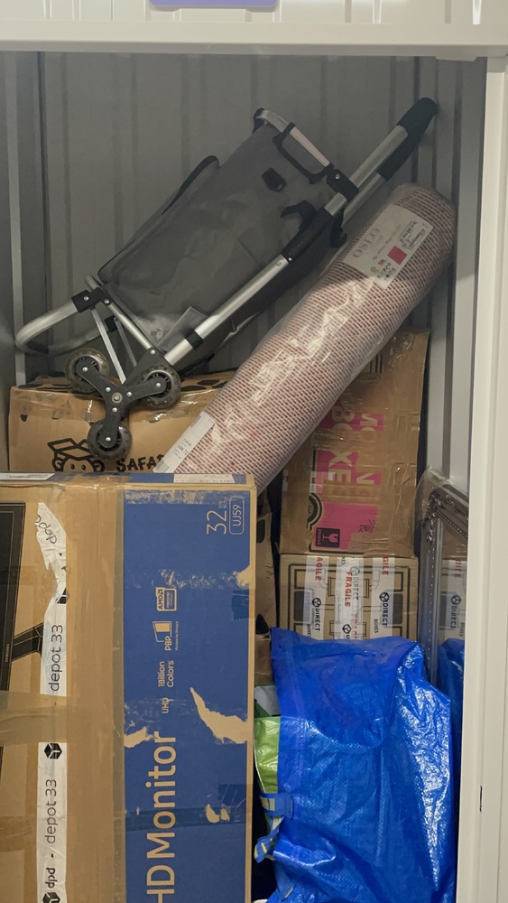This 10 ft.² units had one tall mirror a shopping trolley new rolled up rug TV in a box under a desk, cabinet boxes and bags of personal effects