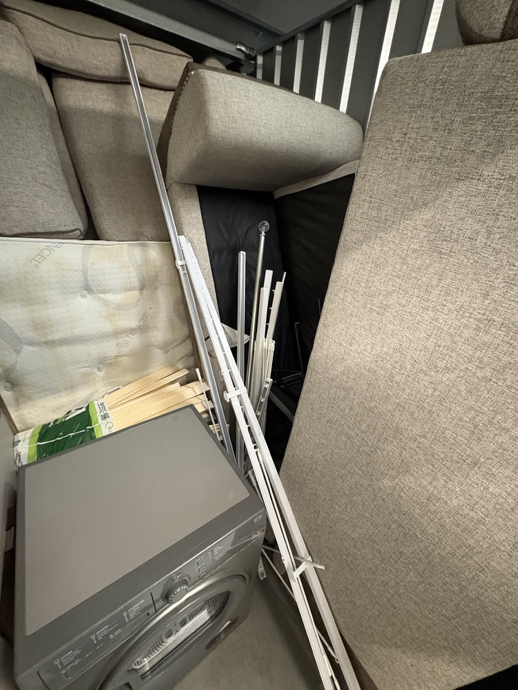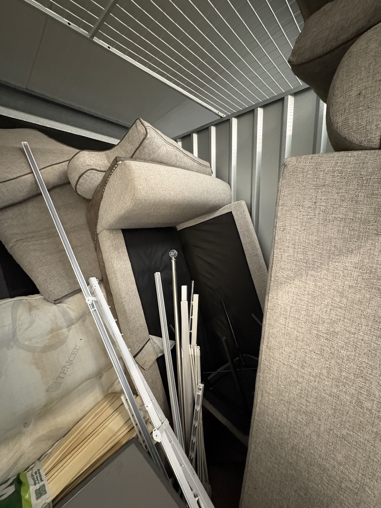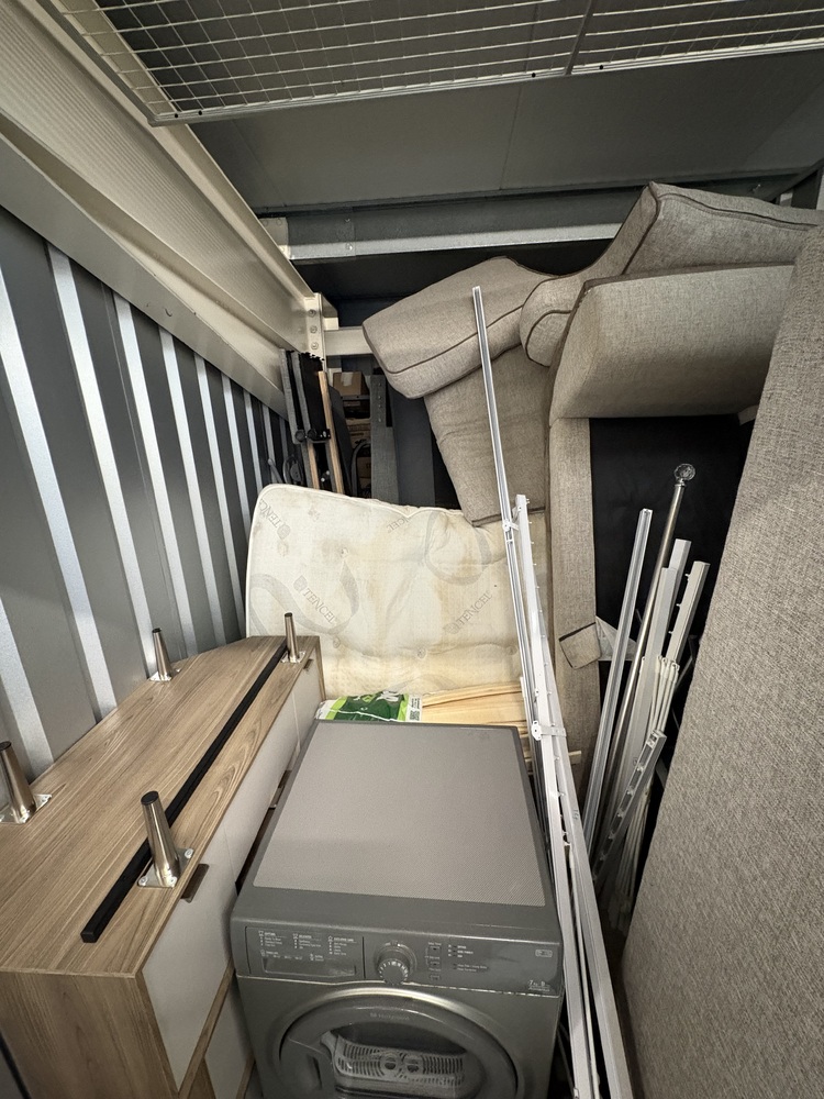 90 sqft unit full of well locked after hosue hold goods. Most noticable items are a curved samsung tv, another flat screen tv. Sofa, Bed frame and matress. The unit is stacked all teh way to the back so lots of boxes to go through.