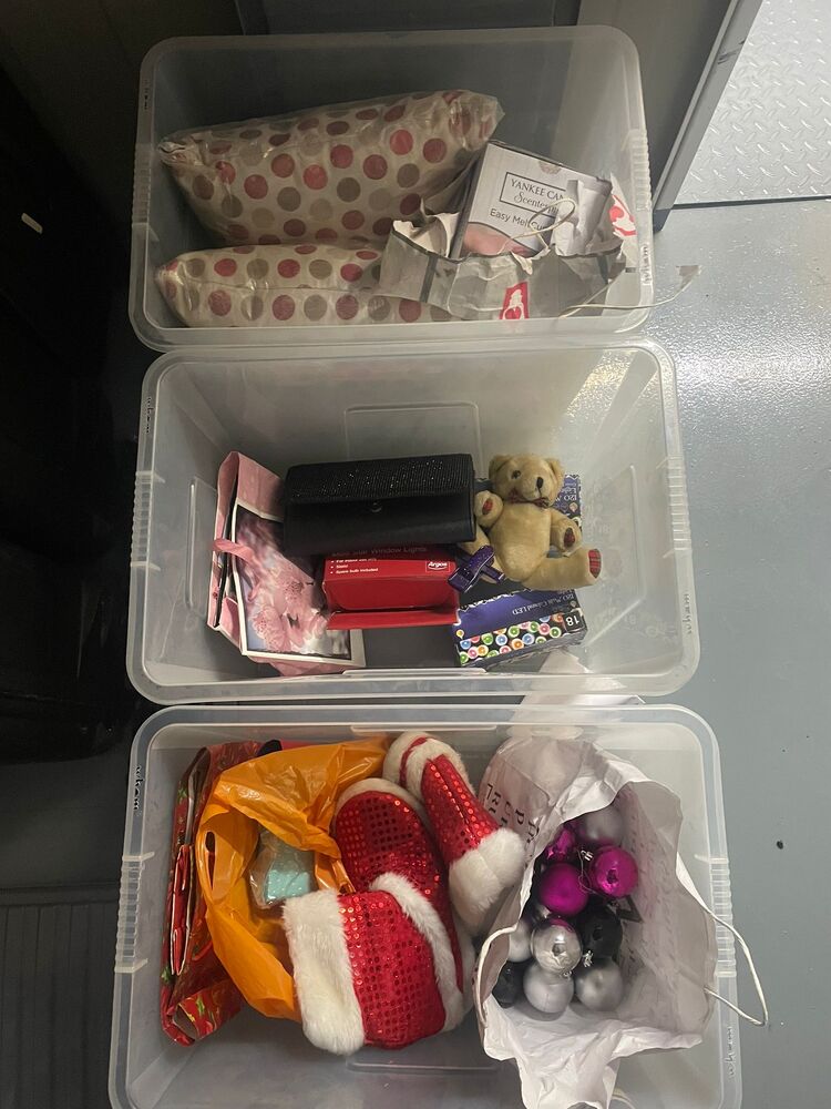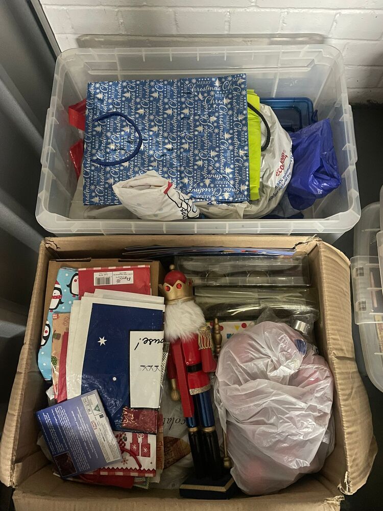 Boxes of Christmas decorations