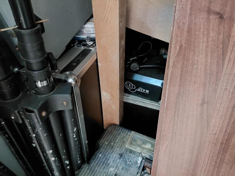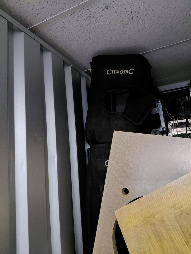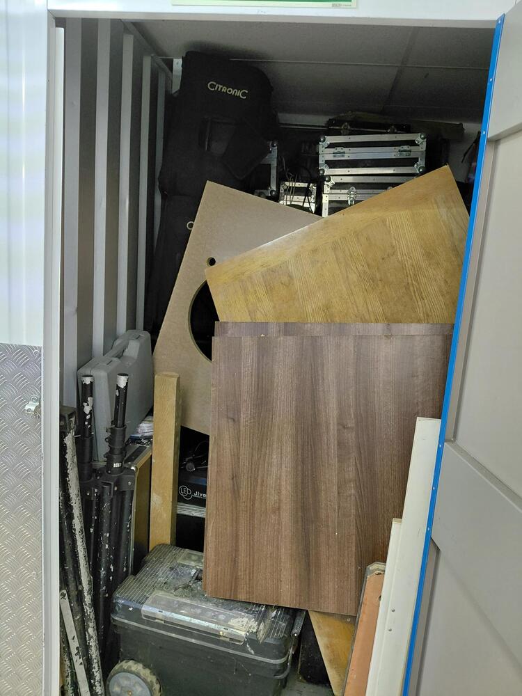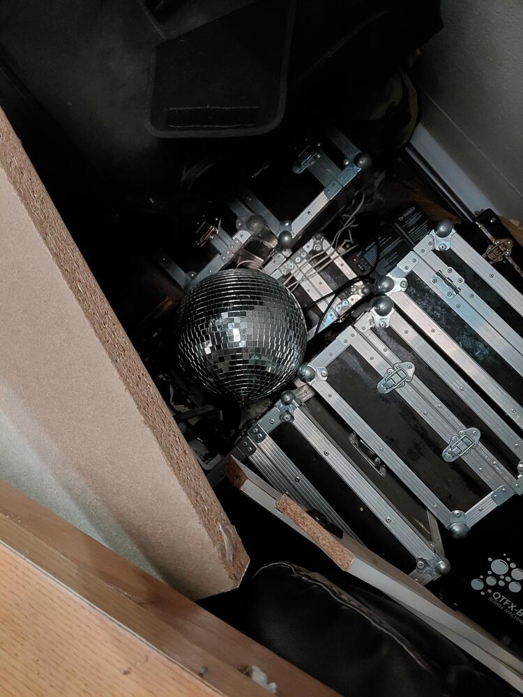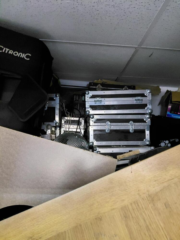 several music flight cases, disco ball, small and large tool box, speakers, wooden panels /table tops