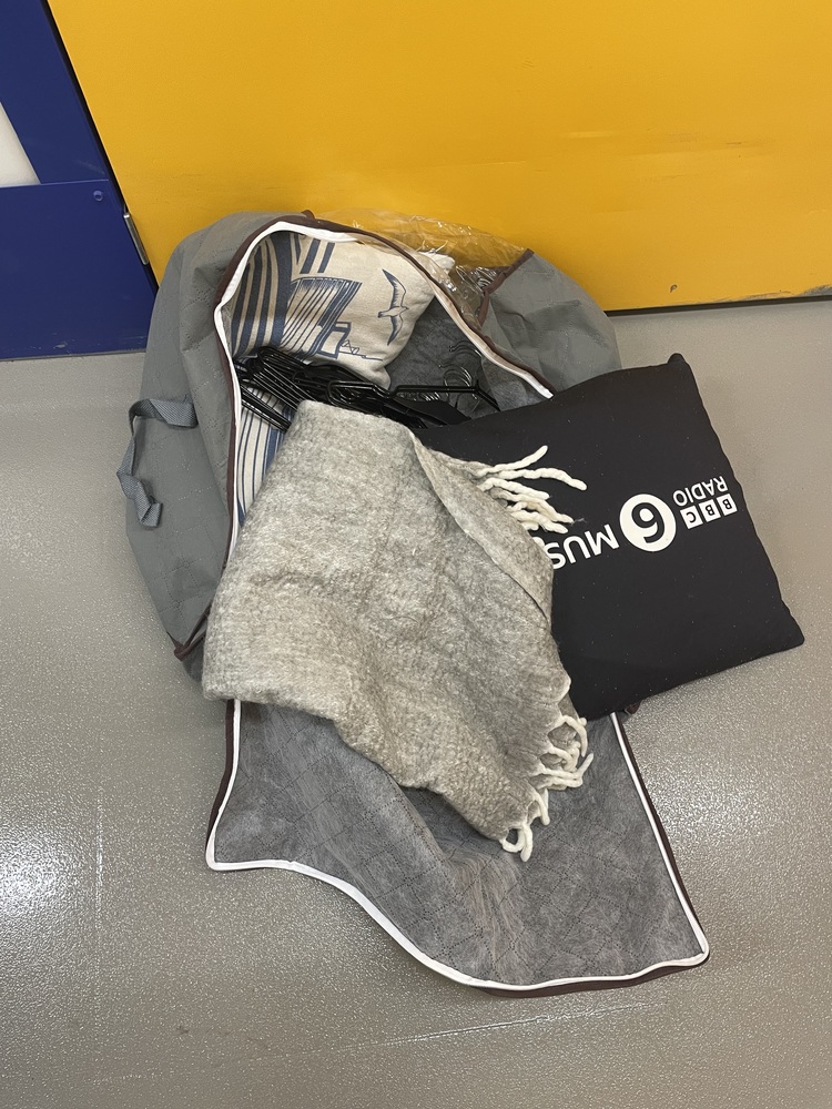 6 bags containing clothing,shoes,baseball cap,hangers,books ,cushions and throw