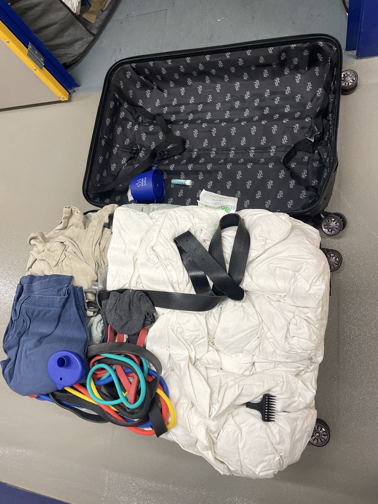 Suitcase containing bedding and clothing